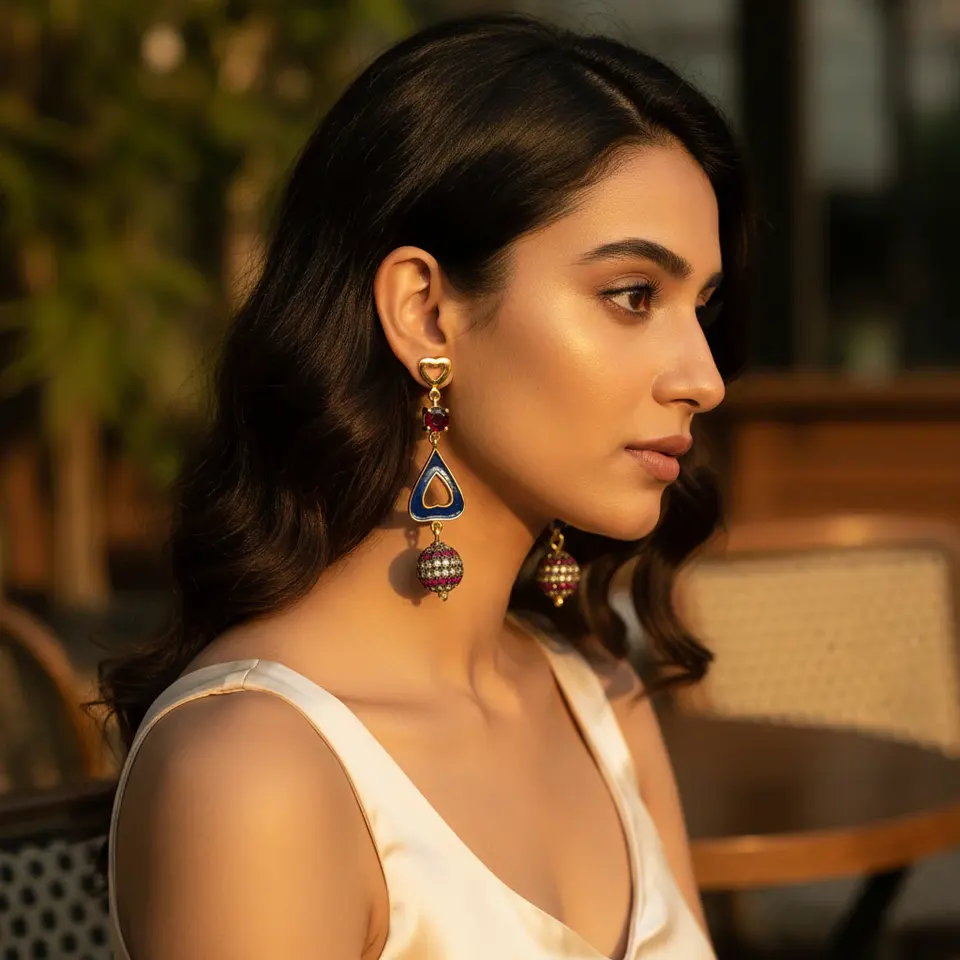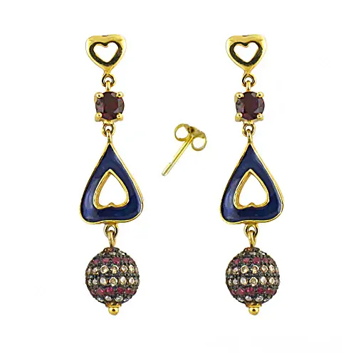 ต่างหูห้อยประดับพลอยโกเมนและเคลือบสีสำหรับผู้หญิง-ชุบทองคำขาว