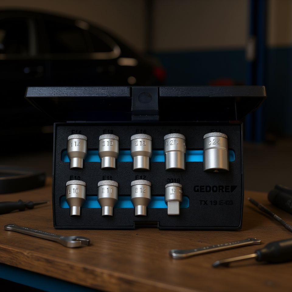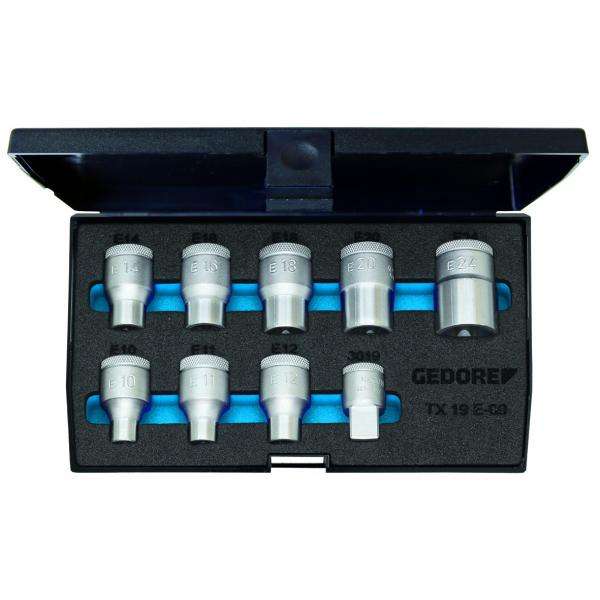 ชุดประแจบล็อก Torx ขนาด 1/2 นิ้ว ยี่ห้อ Gedore ประกอบด้วย 9 ชิ้น สำหรับการขันน็อตอย่างรวดเร็วและมีประสิทธิภาพ