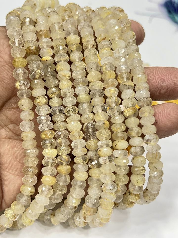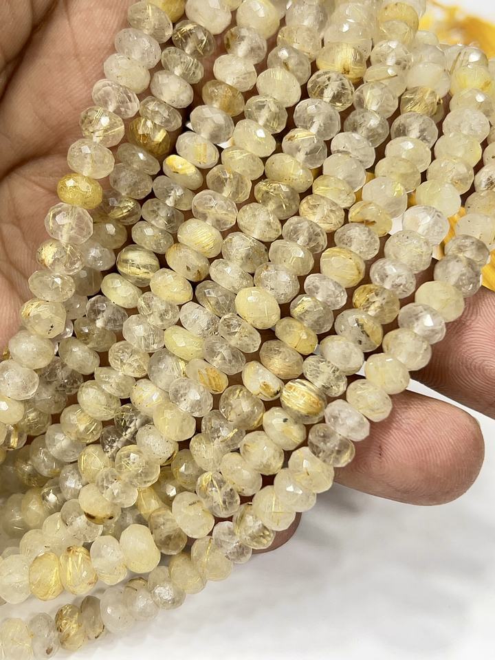 สร้อยข้อมือลูกปัดพลอยควอตซ์รูทิเลตสีทองธรรมชาติเกรด AAA ลูกปัดทรงรอนเดลเหลี่ยมเพชรพลอย ขนาด 8 มม. ความยาว 8 นิ้ว