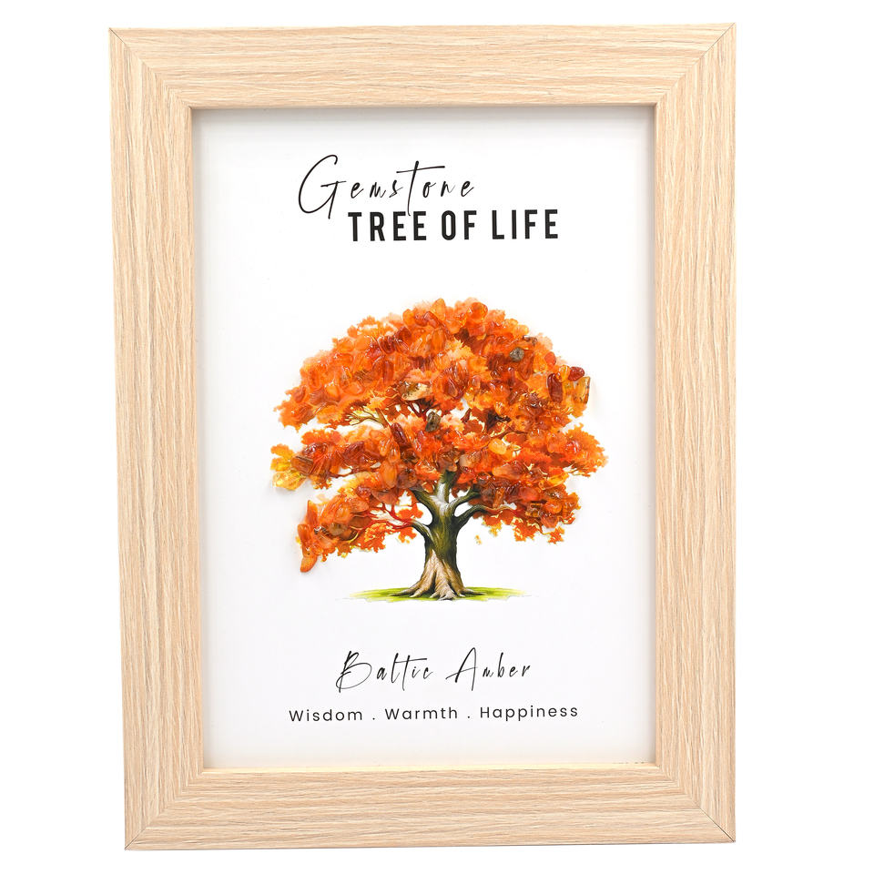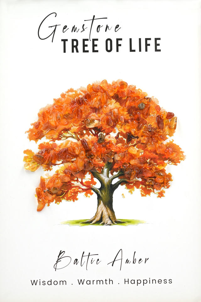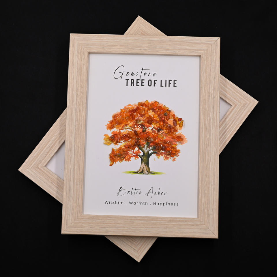 กรอบไม้ติดผนังรูปต้นไม้แห่งชีวิตประดับด้วยอำพันบอลติกสีส้ม งานศิลปะคริสตัลทำมือโดยโรงงานอัญมณีจาอิปุร