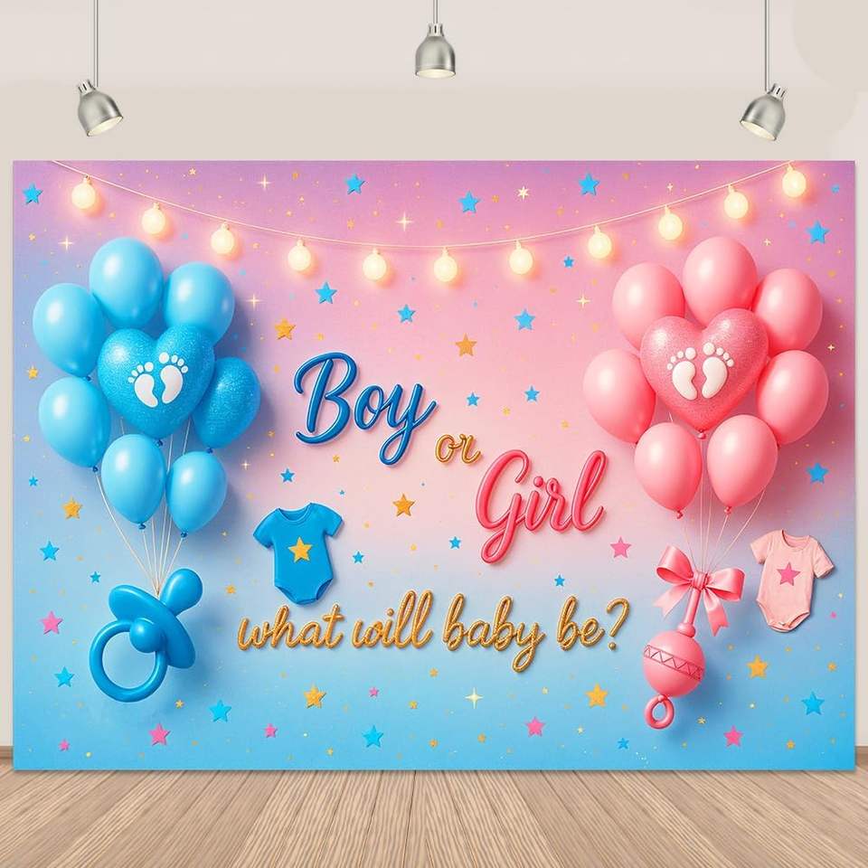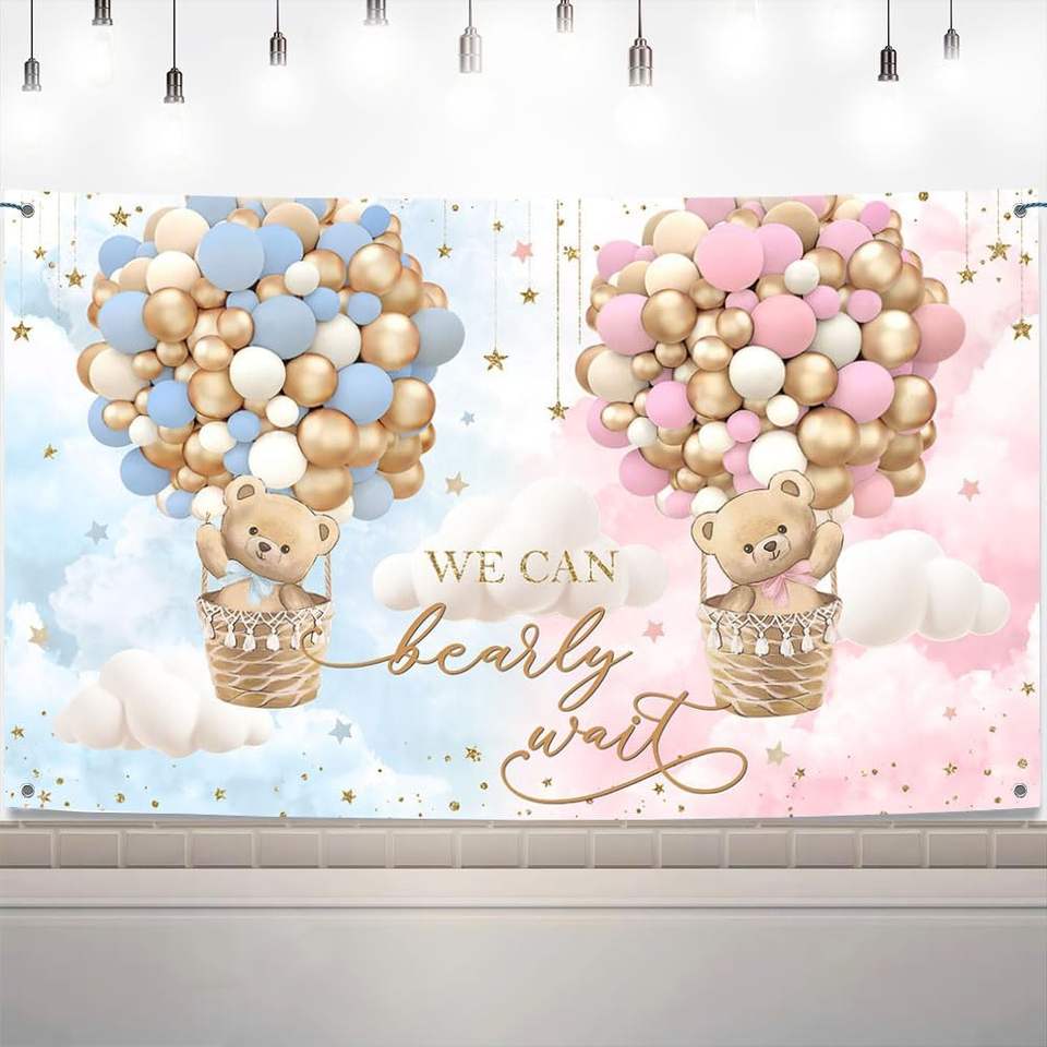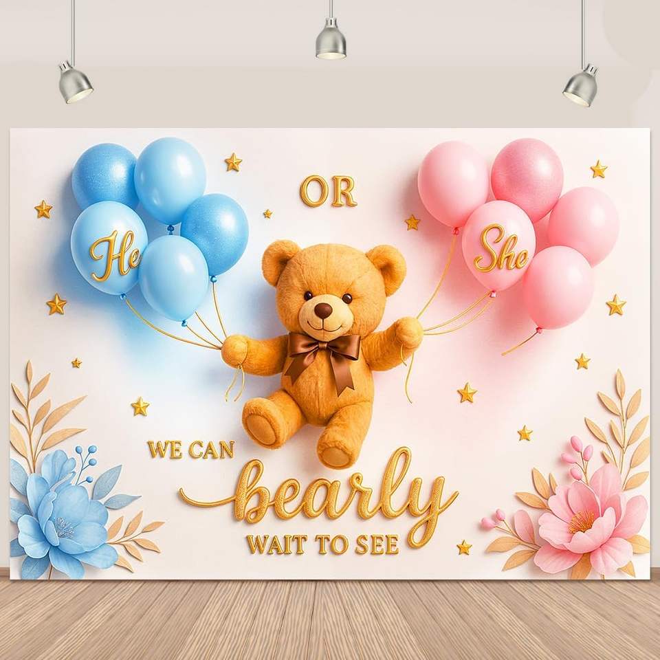 ฉากหลังถ่ายภาพเฉลยเพศเด็ก หมีลูกโป่งสีฟ้าชมพู แบนเนอร์งานเลี้ยงฉลองเบบี้ชาวเวอร์ ปรับแต่งได้