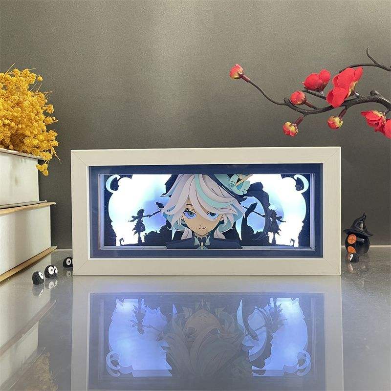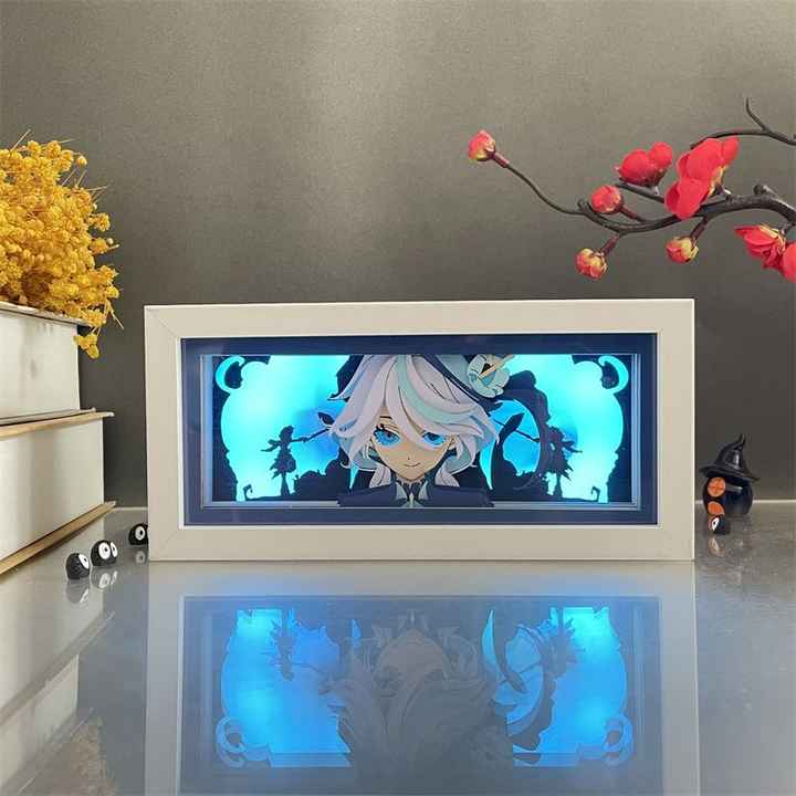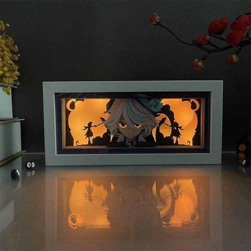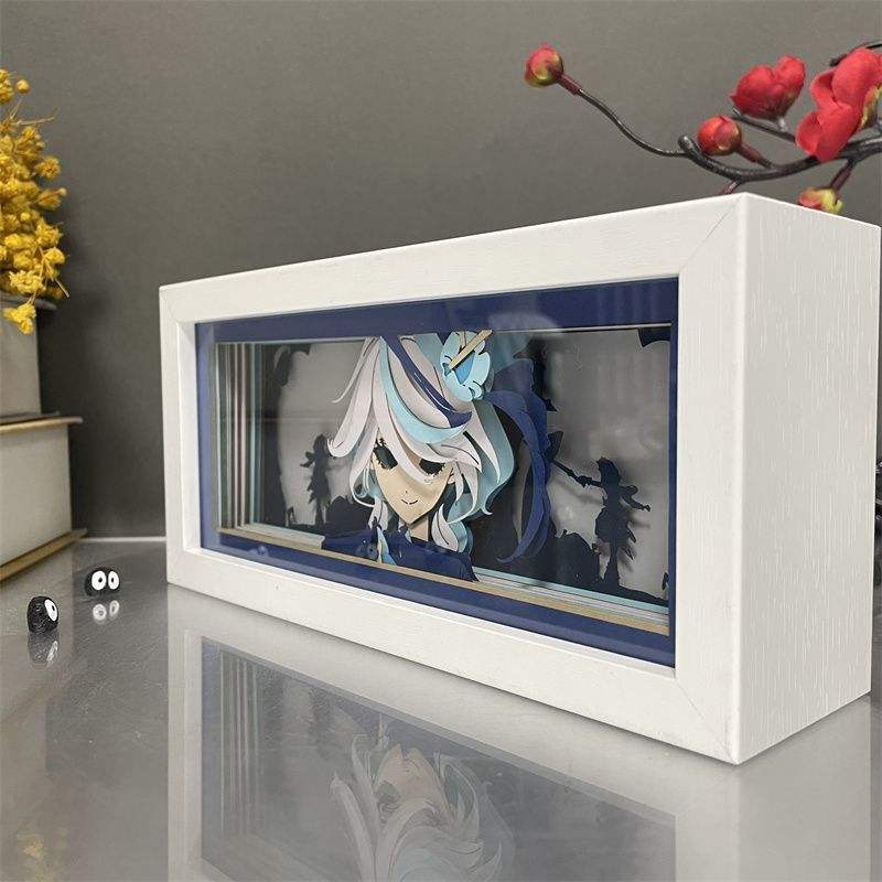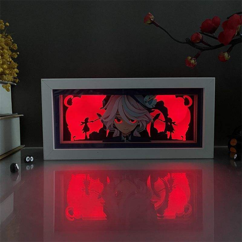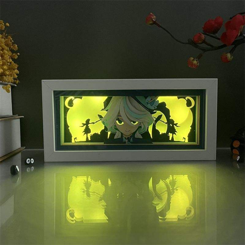 Genshin กระดาษกันกระแทกตัด Raiden Zhongli Xiao 3D อนิเมะโคมไฟกลางคืนตกแต่งห้องกรอบไม้พร้อมภาพเคลื่อนไหว RGB กล่องปริศนา