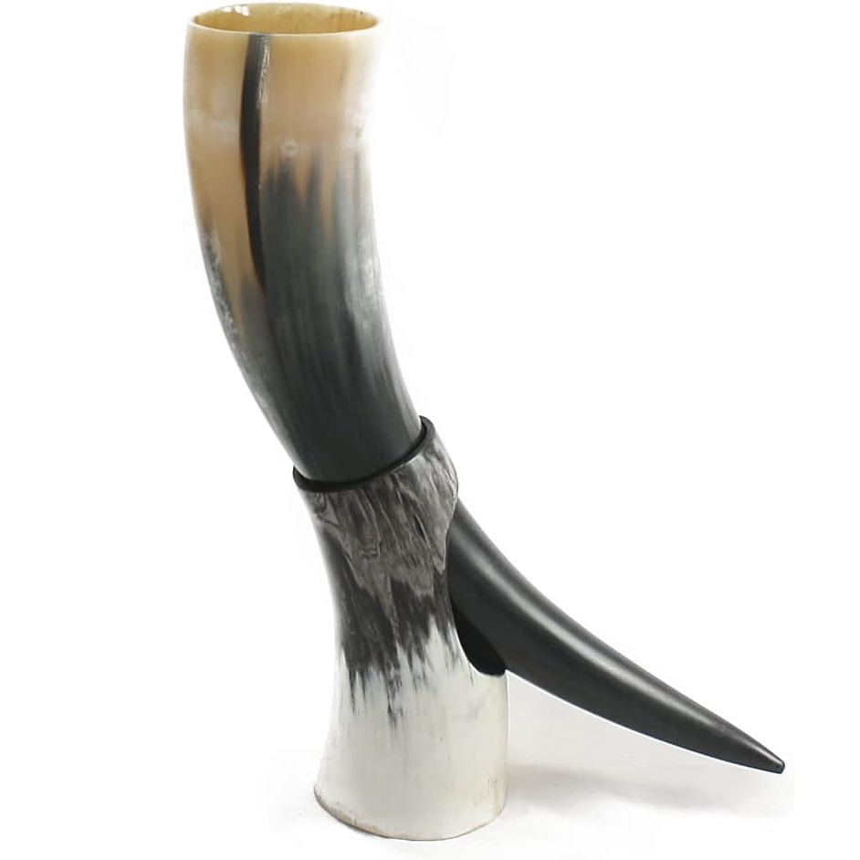 เขาสัตว์แท้โบราณสำหรับดื่มสไตล์ไวกิ้ง แกะสลักด้วยหินอาเกต พร้อมขาตั้งเขาสัตว์ ทำจากทองเหลืองเป็นมิตรกับสิ่งแวดล้อม พร้อมจัดส่ง