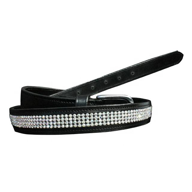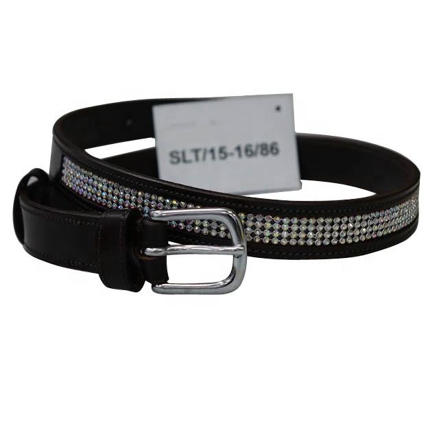 เข็มขัดหนังแท้สีน้ำตาลพร้อมคริสตัลสีทองและสีขาวพร้อมหัวเข็มขัดเงิน