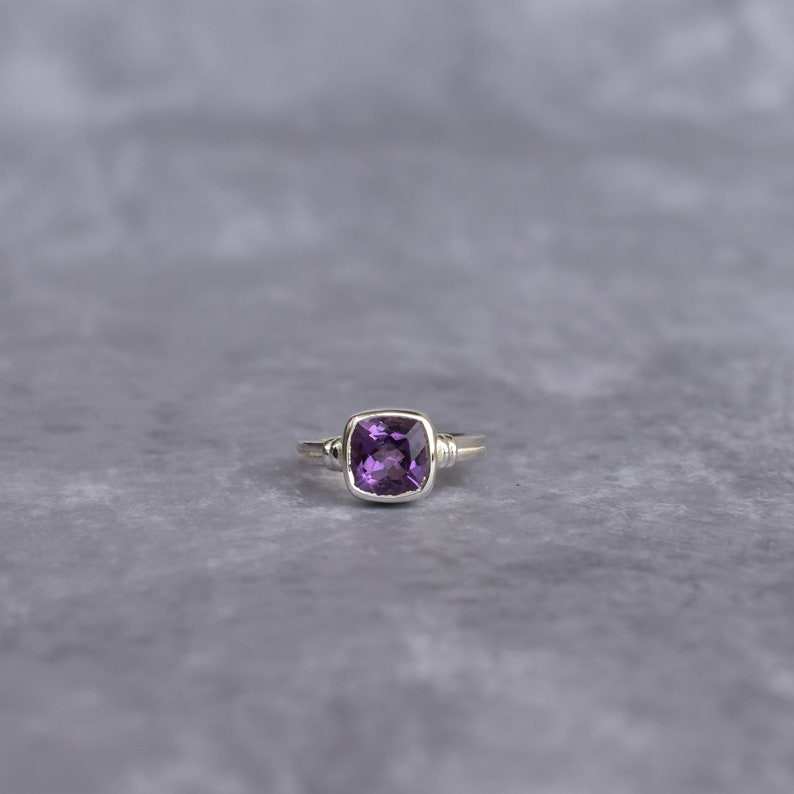 แหวนพลอยอเมทิสต์แบบตัดเป็นเบาะสไตล์วินเทจสำหรับผู้หญิงทำด้วยมือเงินสเตอร์ลิงสีม่วงไม่ซ้ำใครเครื่องประดับสำหรับงานแต่งงานควอตซ์สีม่วง