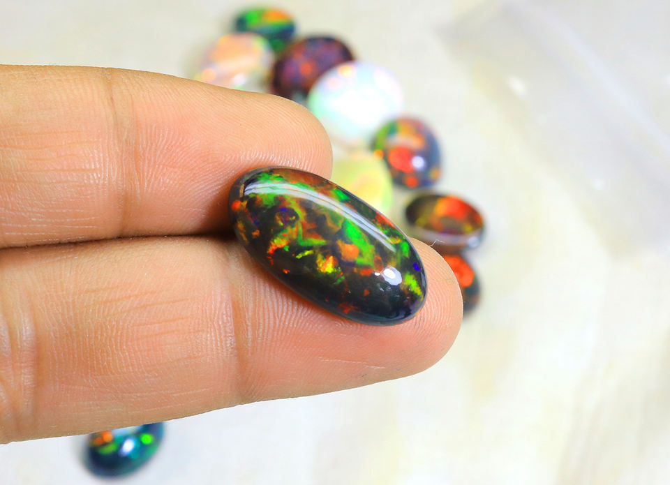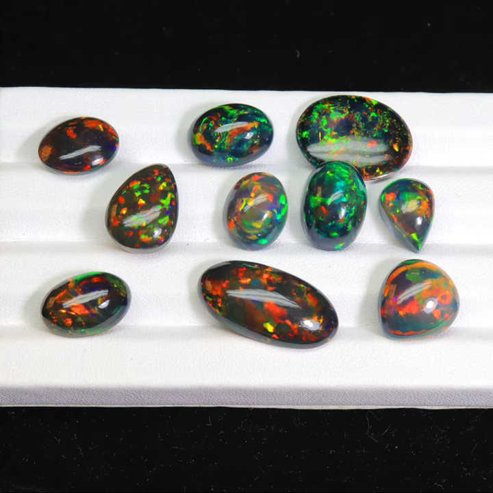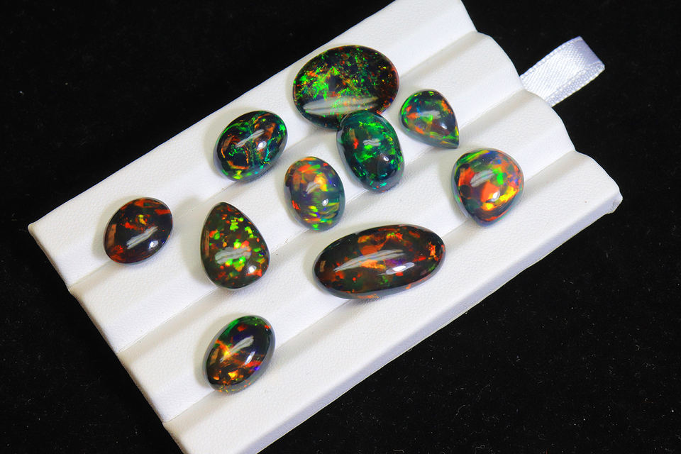 โอปอลดำเอธิโอเปียแท้ ทรงหลังเบี้ย 68 กะรัต ล็อต - โอปอลดำรมควัน 10 ชิ้น รูปทรงคละแบบ ราคาขายส่ง