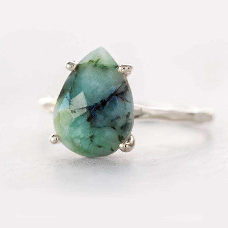 พลอยแท้ลูกปัดธรรมชาติสีเขียวดิบมรกตรูปทรงหยดน้ำแหวนเงินสเตอร์ลิงอาจเกิดคอลเลกชันสไตล์ตัด