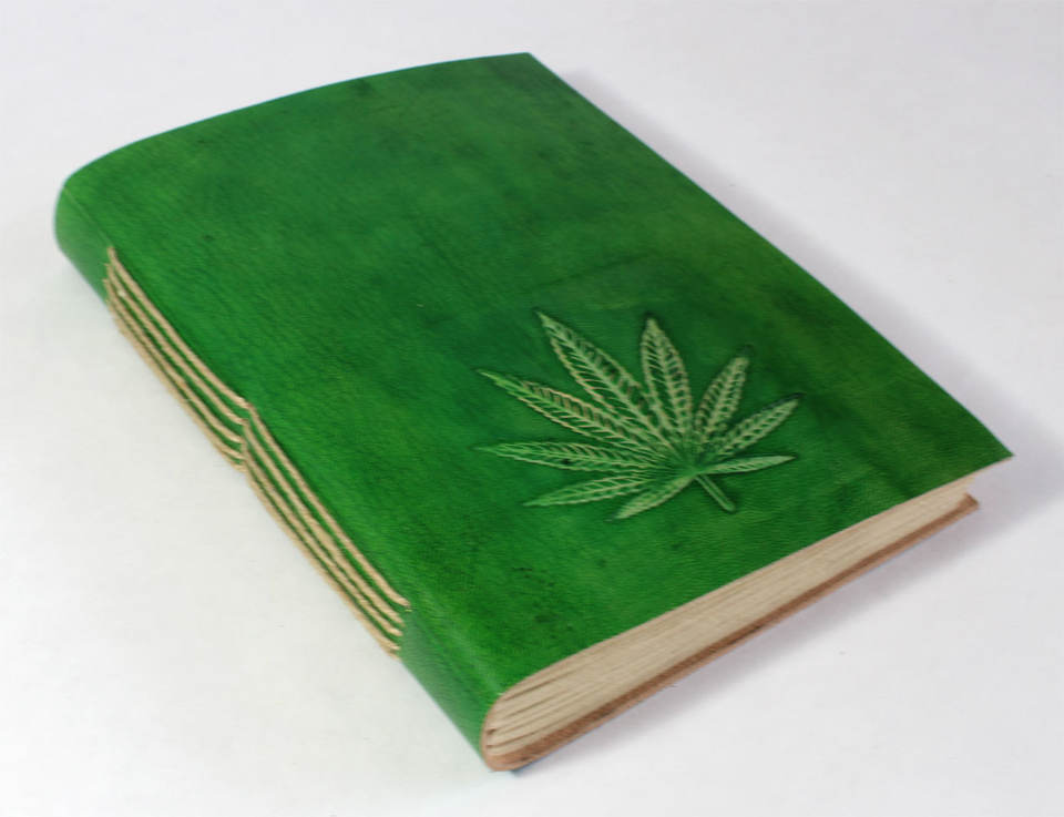 สมุดบันทึกปกแข็งหนังแพะแท้สีเขียว พร้อมปกหน้าลายนูนรูปใบกัญชา สำหรับใช้บันทึกประจำวัน