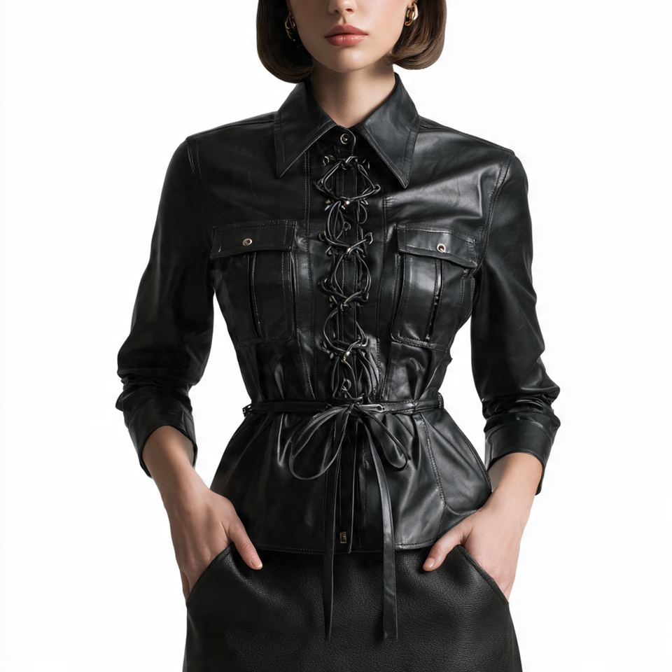 เสื้อผู้หญิงหนัง PU แขนยาวมีกระดุมหนังแท้