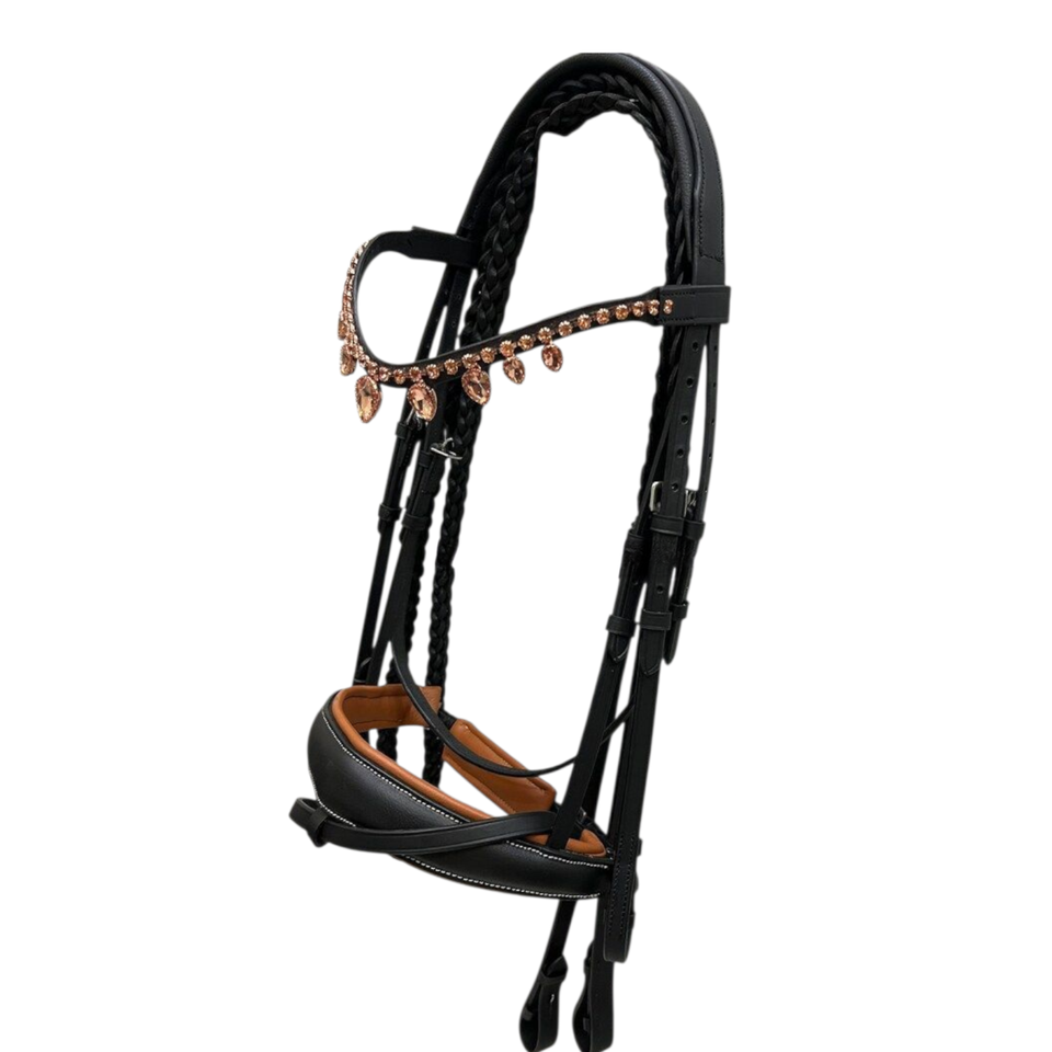 บังเหียนม้าหนังแท้ปรับแต่งได้ แฟชั่นสำหรับขี่ม้า ประดับคริสตัลที่สายคาดหน้าผาก สายรัดจมูกแบบมีแผ่นรอง สายบังเหียนแบบถัก สไตล์อังกฤษ
