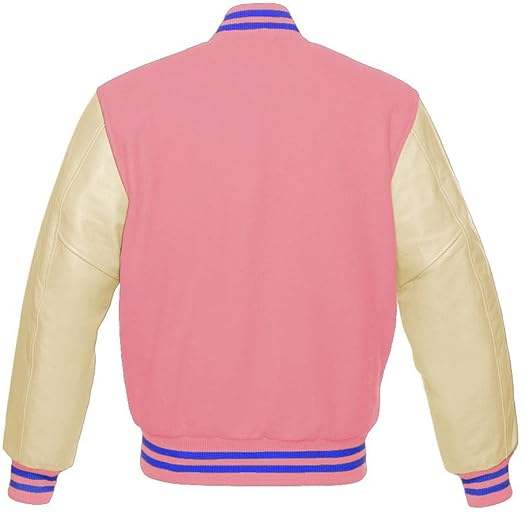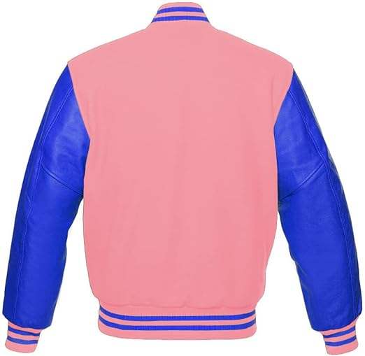 เสื้อแจ็คเก็ตเบสบอลแบบวาร์ซิตี้ ปักลายตามสั่ง ทำจากผ้าขนสัตว์สีชมพูอ่อนแท้ พร้อมแขนเสื้อหนังแท้ลายทางสีน้ำเงิน แบบของที่ระลึก