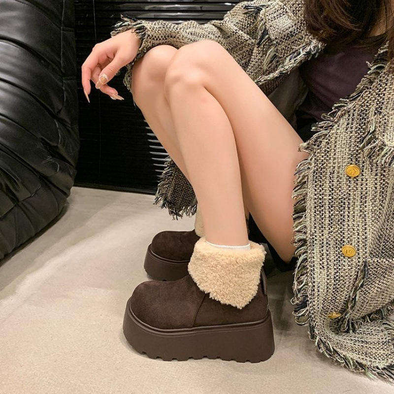 รองเท้าบูทหิมะพื้นหนาหนังแท้สำหรับผู้หญิงรองเท้าบูทสั้นผ้าคอตตอนสีเหลืองขนาดเล็กฤดูใบไม้ร่วงฤดูหนาว