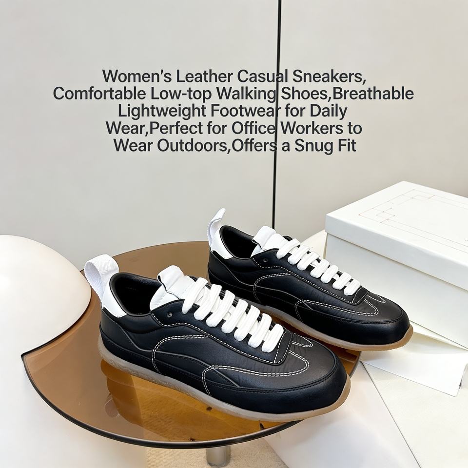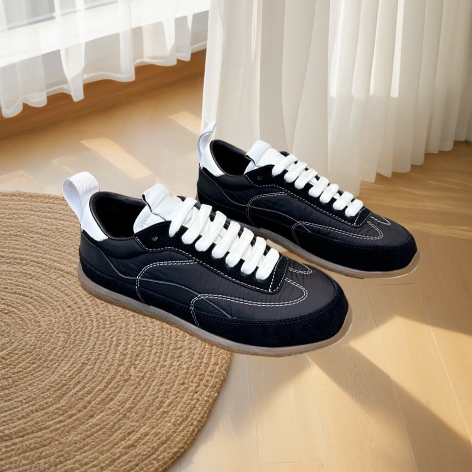 รองเท้าผ้าใบหนังแท้แบบสวม พื้นกันลื่น เชือกผูกรองเท้าขนาดใหญ่ พื้นยางกัม ยูนิเซ็กส์ สีดำขาว ทรงเตี้ย สไตล์เรโทร แฟชั่น