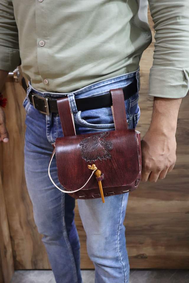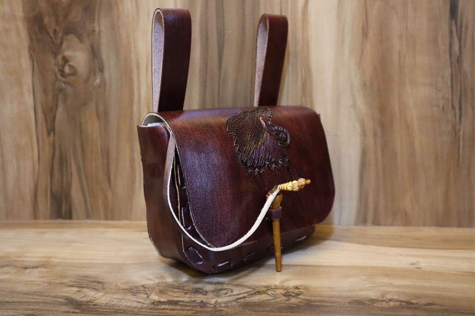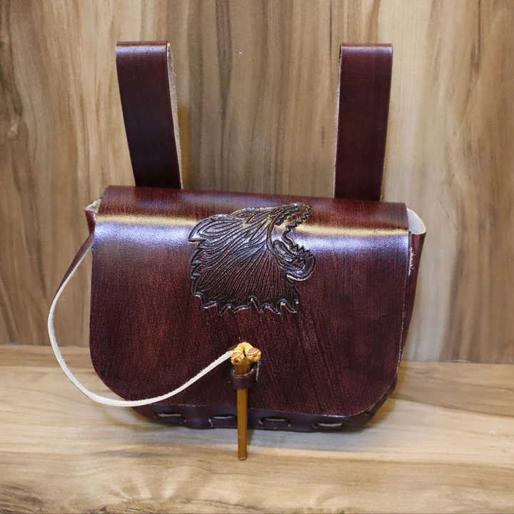 กระเป๋าคาดเอวหนังแท้ลายหมาป่ายุคกลางกระเป๋าหนังเครื่องมือไวกิ้งสีน้ำตาลกระดุมทำมือขนาดใหญ่