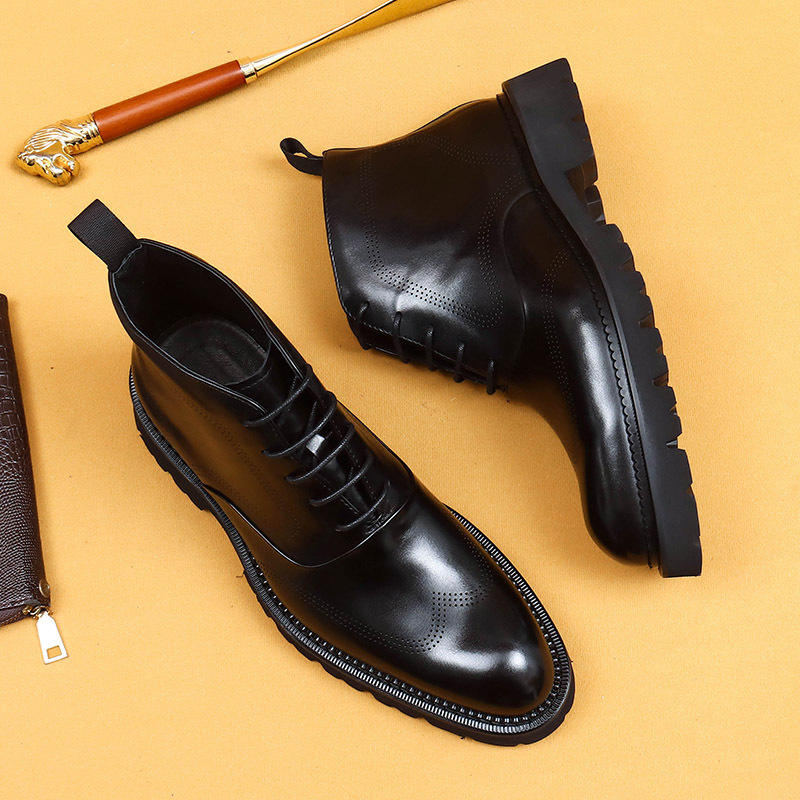 รองเท้าบูทหนังแท้ ดีไซน์ธุรกิจลำลองสีดำพรีเมียม หัวแหลม สไตล์อังกฤษ หุ้มข้อสูง สำหรับฤดูใบไม้ร่วง