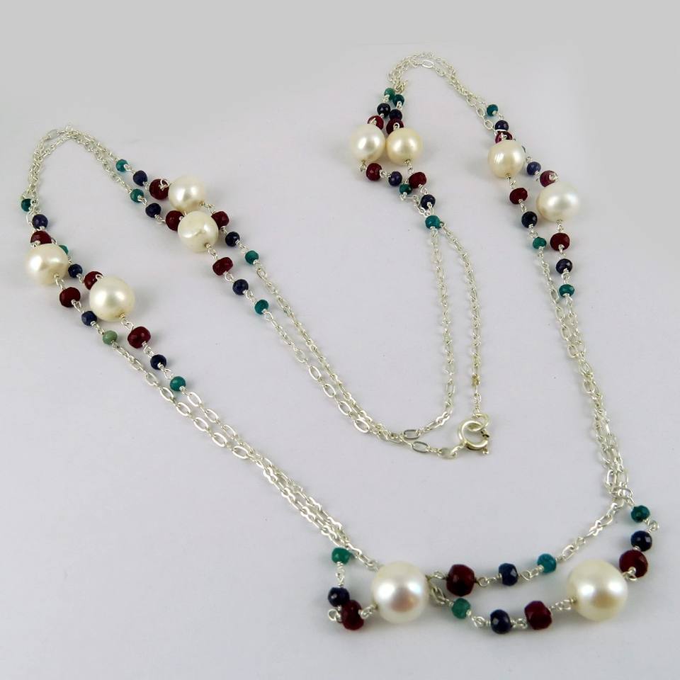มุกแท้ทับทิมสีฟ้าไพลินมรกต925สร้อยคอเงินสเตอร์ลิงเครื่องประดับเงินที่ไม่ซ้ำกันขายส่งเครื่องประดับเงิน