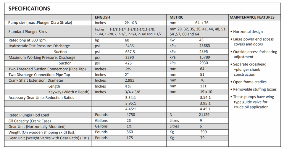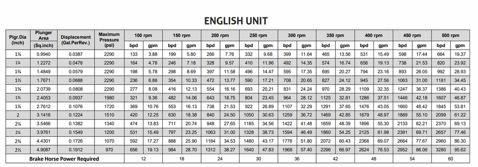การเคลื่อนย้าย:3280 bpd (95.62 GPM) ที่ 970 psig 664 bpd (19.36 gpm) ที่ 2290 psig