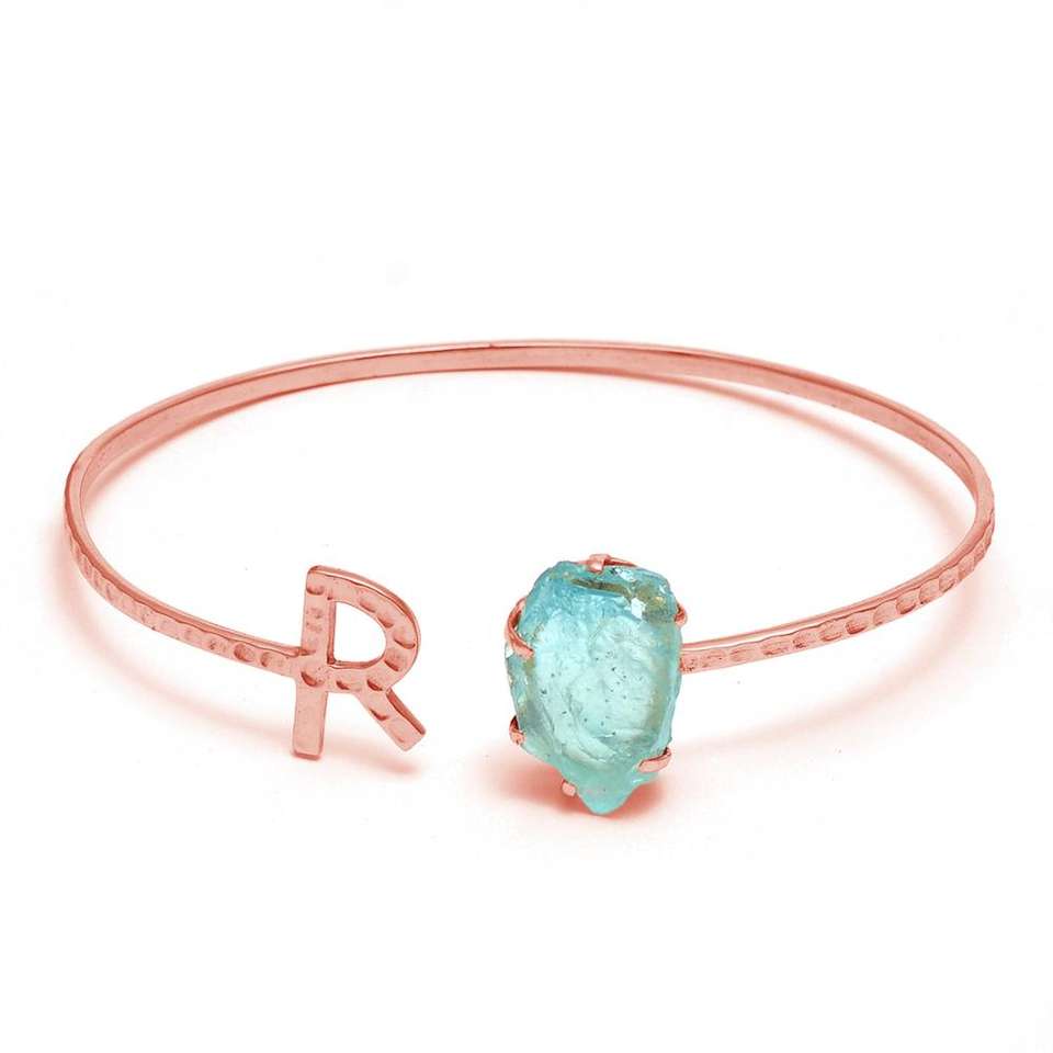 อัญมณีพลอยอะความารีนหยาบของแท้925กำไลชุบทองสร้อยข้อมืออักษรตัว R เริ่มต้นทำด้วยมือผู้จัดจำหน่ายเครื่องประดับ
