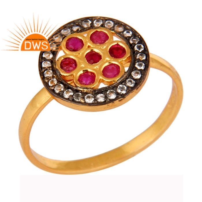 ของแท้รอบตัดทับทิมและสีขาวบุษราคัมพลอยแหวนเครื่องประดับผู้ผลิตสีเหลืองทองชุบเงินสเตอร์ลิงแหวนเครื่องประดับขายส่ง