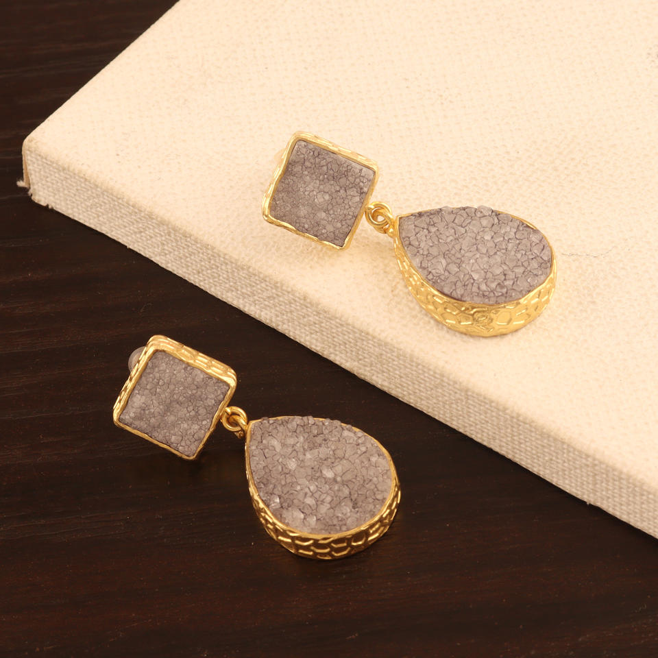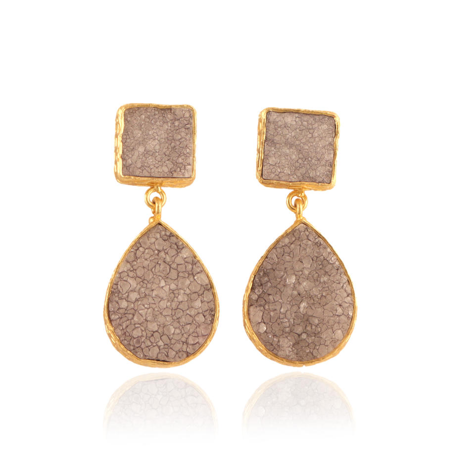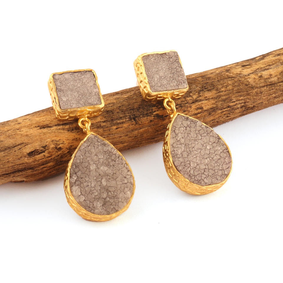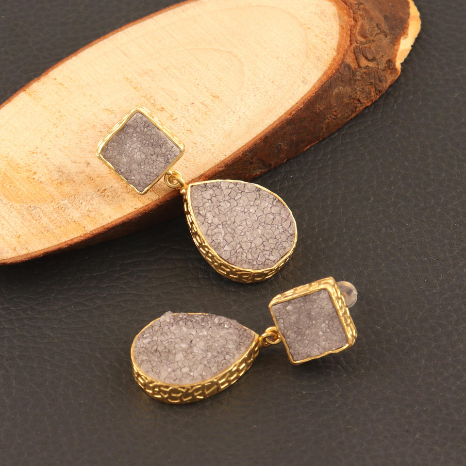 เพชรแท้สีเทาน้ำตาลดรูซี่จระเข้เสร็จสิ้นการตั้งค่า COLLET แกนต่างหูห้อยชุบทอง18K หยดหินคู่