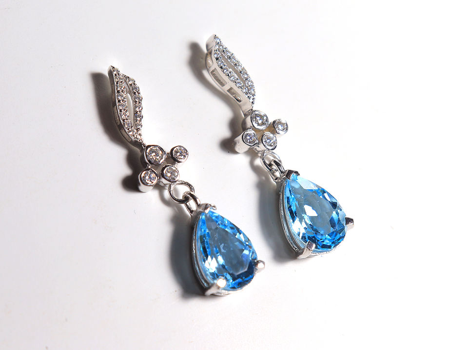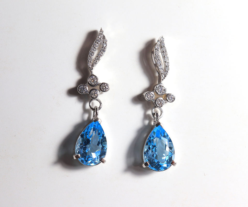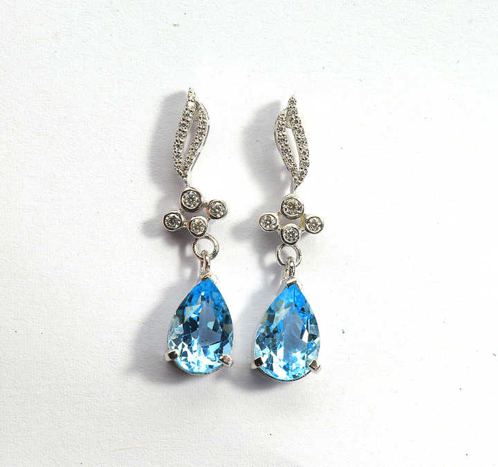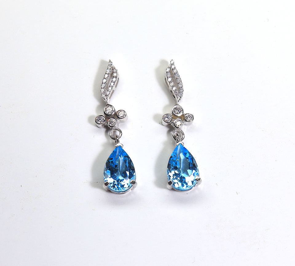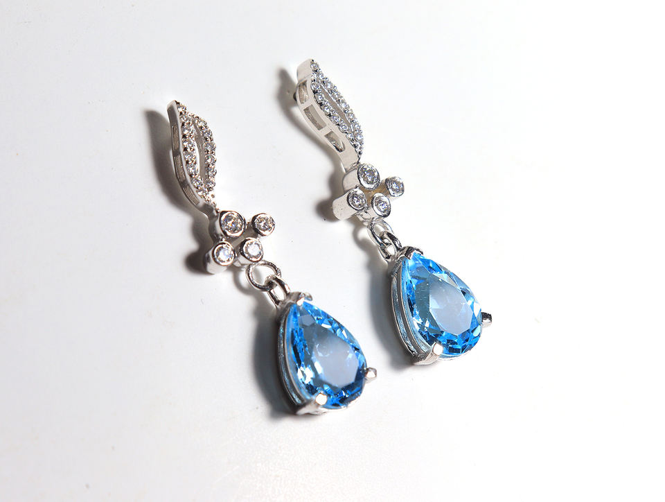 ต่างหูพลอยบลูโทแพซแท้จากสวิสเซอร์แลนด์ รูปทรงลูกแพร์ ขนาด 10x7 มม. ขัดเงาอย่างดี ของขวัญสำหรับเธอ