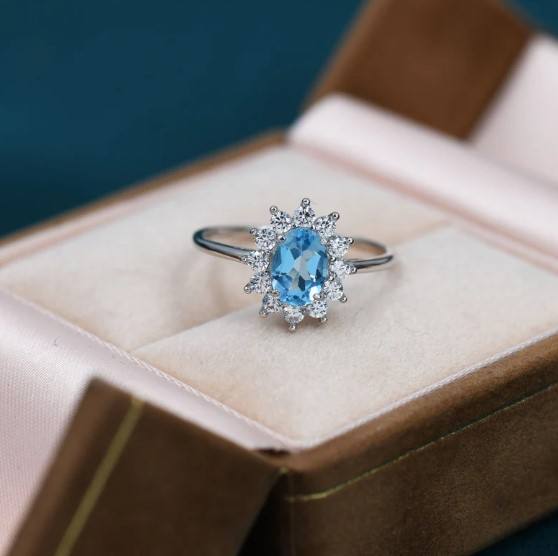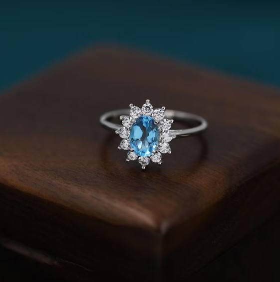 แหวนเงินแท้ประดับบลูโทแพซแท้จากสวิสและเพชร CZ ทรงฮาโล แหวนโทแพซธรรมชาติ แหวนซ้อนกันได้