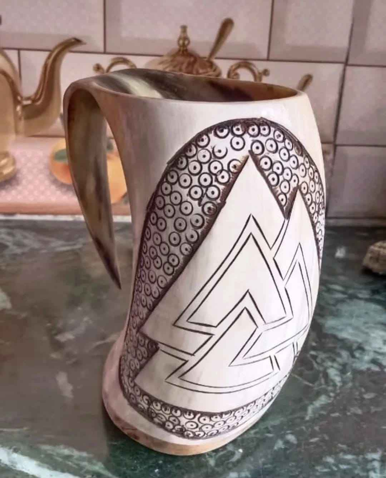 แก้วเบียร์เซรามิกไวกิ้งแท้ขนาด16ออนซ์สำหรับดื่มน้ำและดื่มแตรขอบทองสำหรับปาร์ตี้ซื้อแก้วเบียร์แตรขนาดกำหนดเองและแกะสลักด้วยมือ