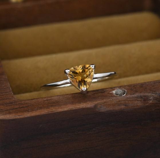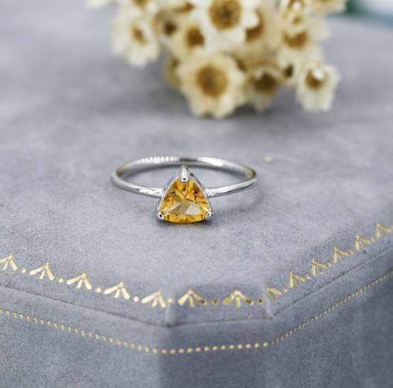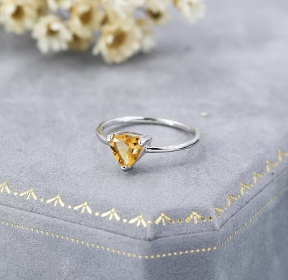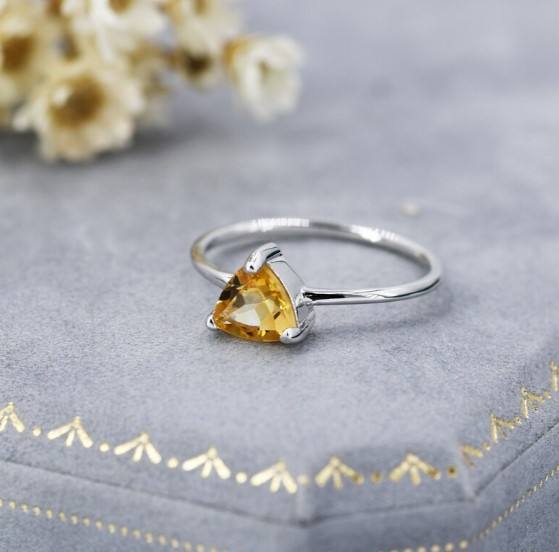 แหวนซิทรินสีเหลืองแท้ในตัวเรือนเงินแท้ 925 พร้อมแหวนซ้อนทรงทริลเลียนคัทจากอัญมณีธรรมชาติ
