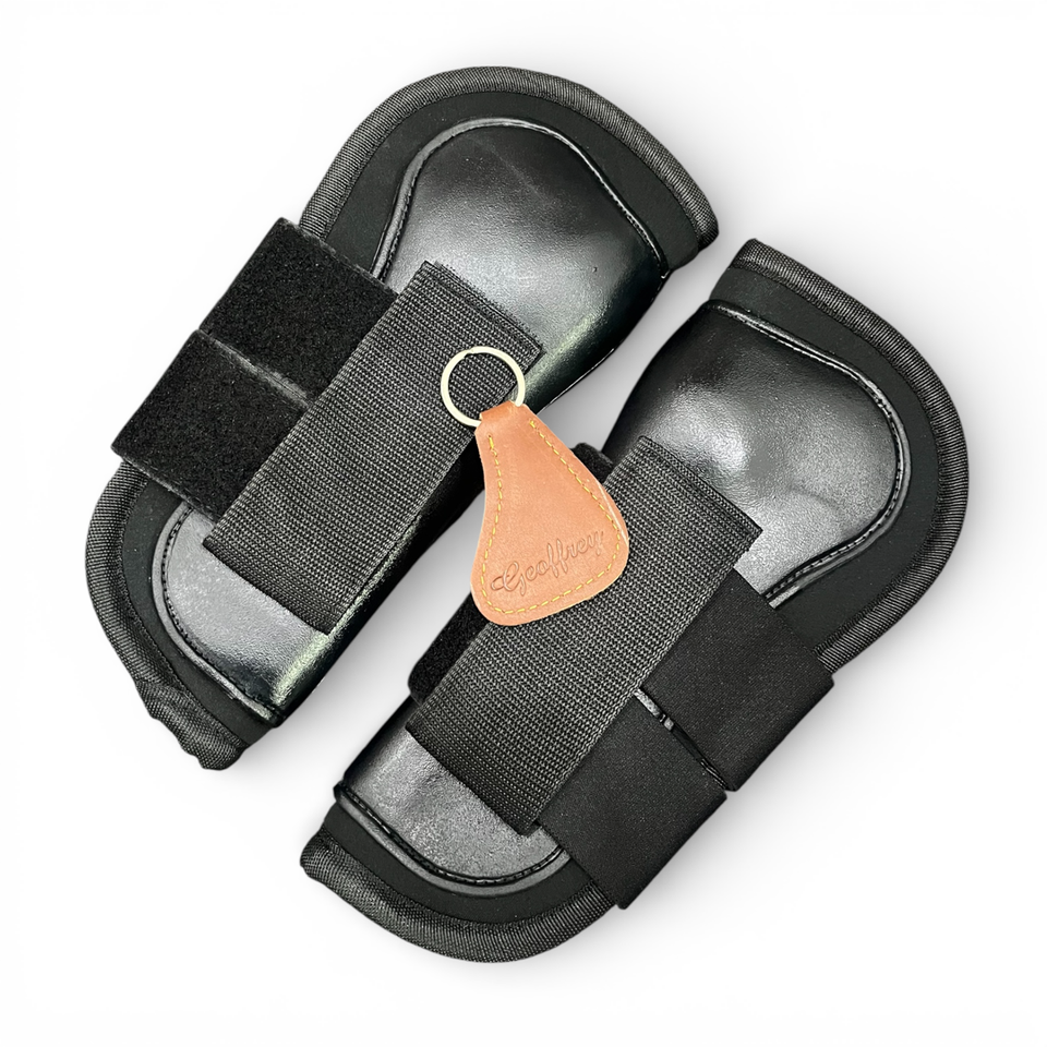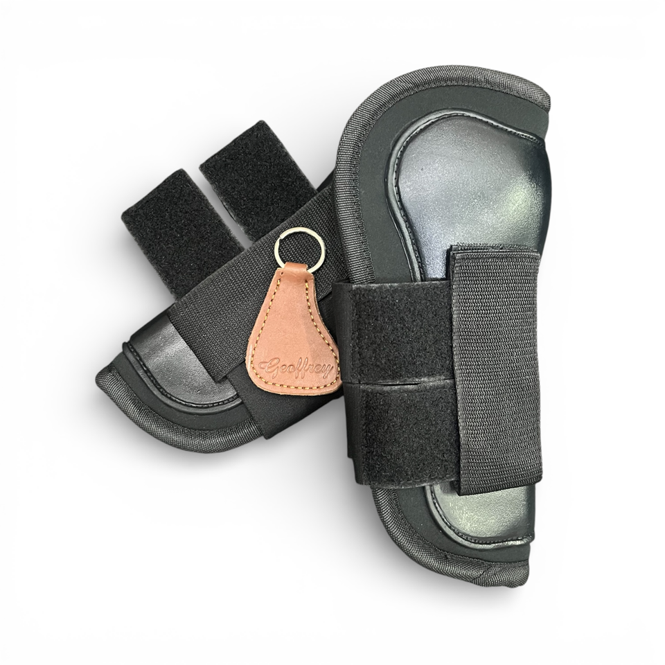 รองเท้ากันกระแทกสำหรับม้าแข่ง Geoffrey Equestrian รุ่น Galloping Tendon Shoes ทำจากวัสดุ PVC สีดำ บุฟองน้ำเพื่อการปกป้องที่ดีที่สุด เหมาะสำหรับการแข่งขัน