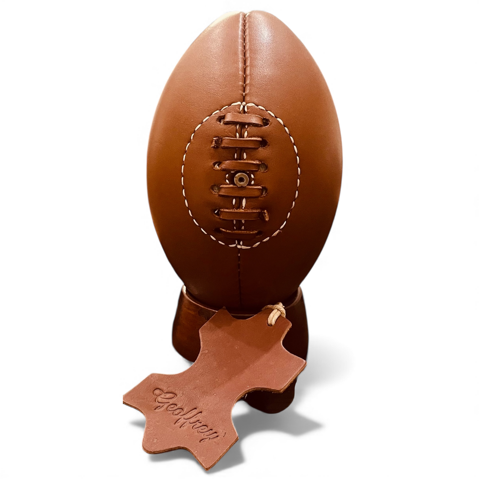 ลูกฟุตบอลรักบี้ขนาดเล็ก ยี่ห้อ Geoffrey รุ่นวินเทจย้อนยุค สีแทน ทำจากหนังวัวแท้ 100% 4 แผ่น ขนาด 2 น้ำหนักเบา ทนทาน เหมาะสำหรับการเล่นกีฬา