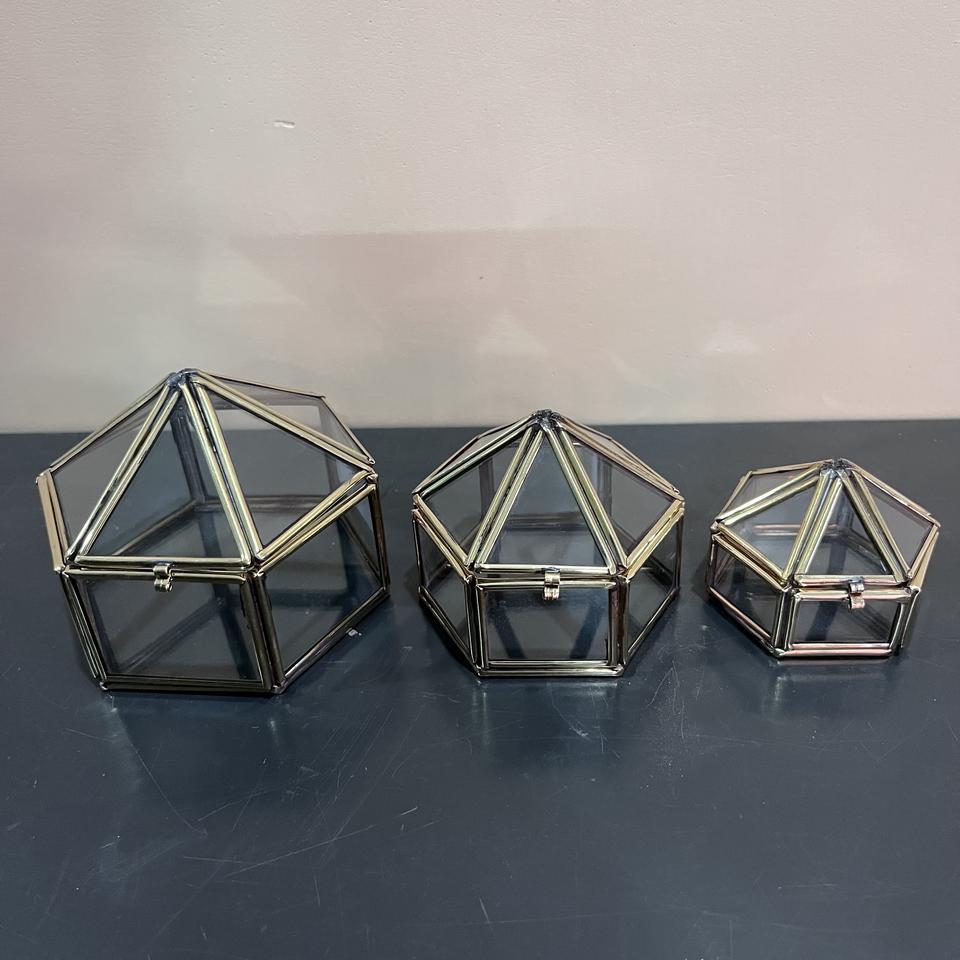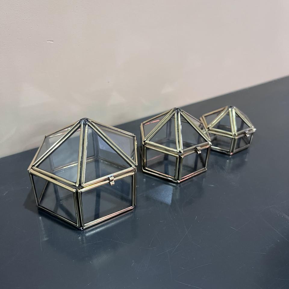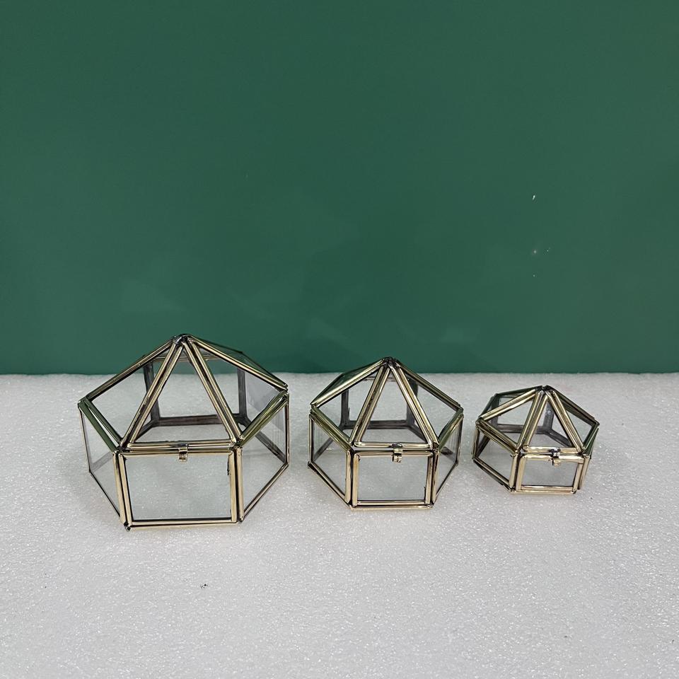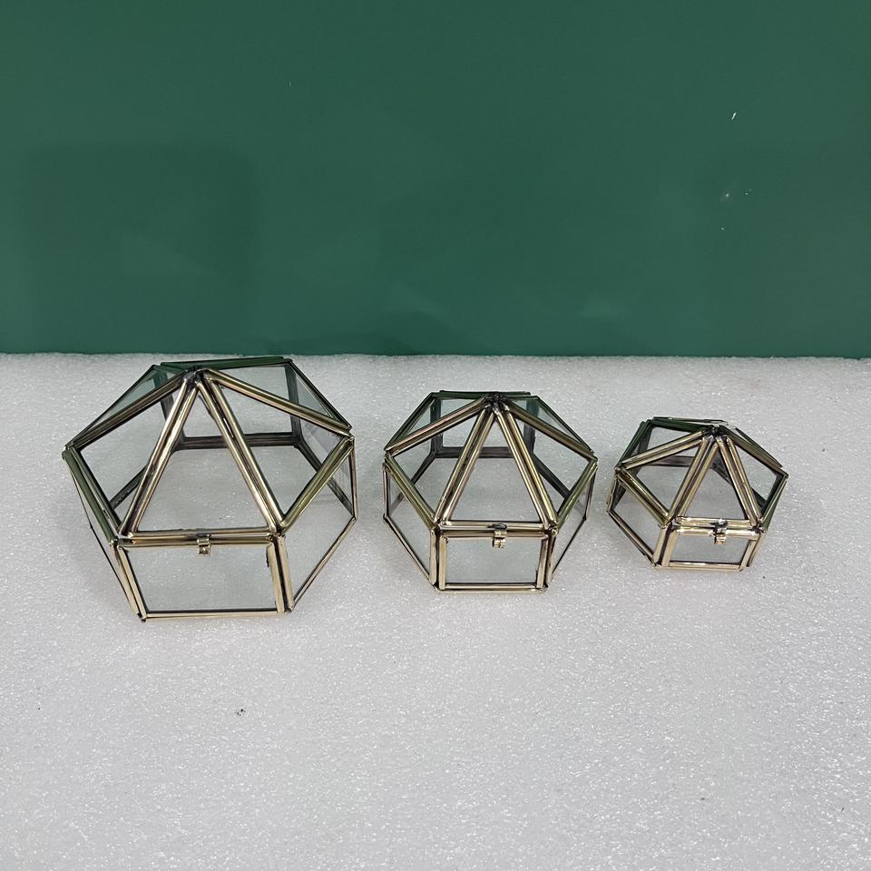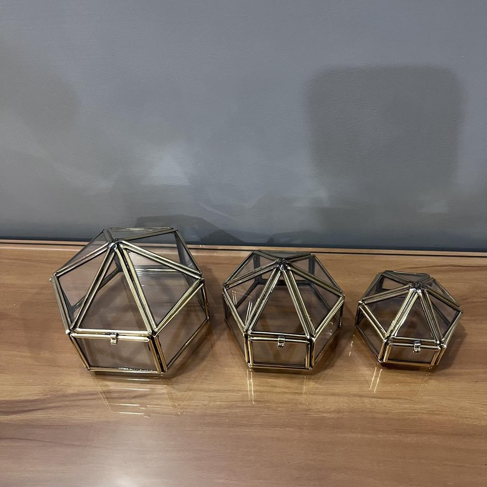 กล่องเครื่องประดับแก้วทรงเรขาคณิต ชุด 3 ชิ้น กล่องใส่ของกระจกทองเหลืองวินเทจ กล่องใส่แหวนแต่งงาน กล่องโชว์แก้วใส ของตกแต่งบ้าน
