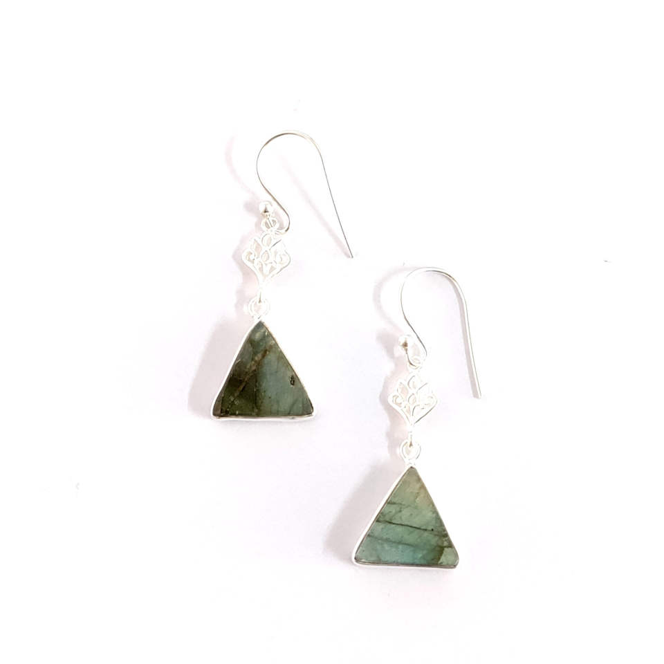 ต่างหูลาบราดอไรต์ทรงเรขาคณิต น้ำหนัก 4.2 กรัม ประดับแบบฝังขอบ ดีไซน์โดดเด่นมีสไตล์