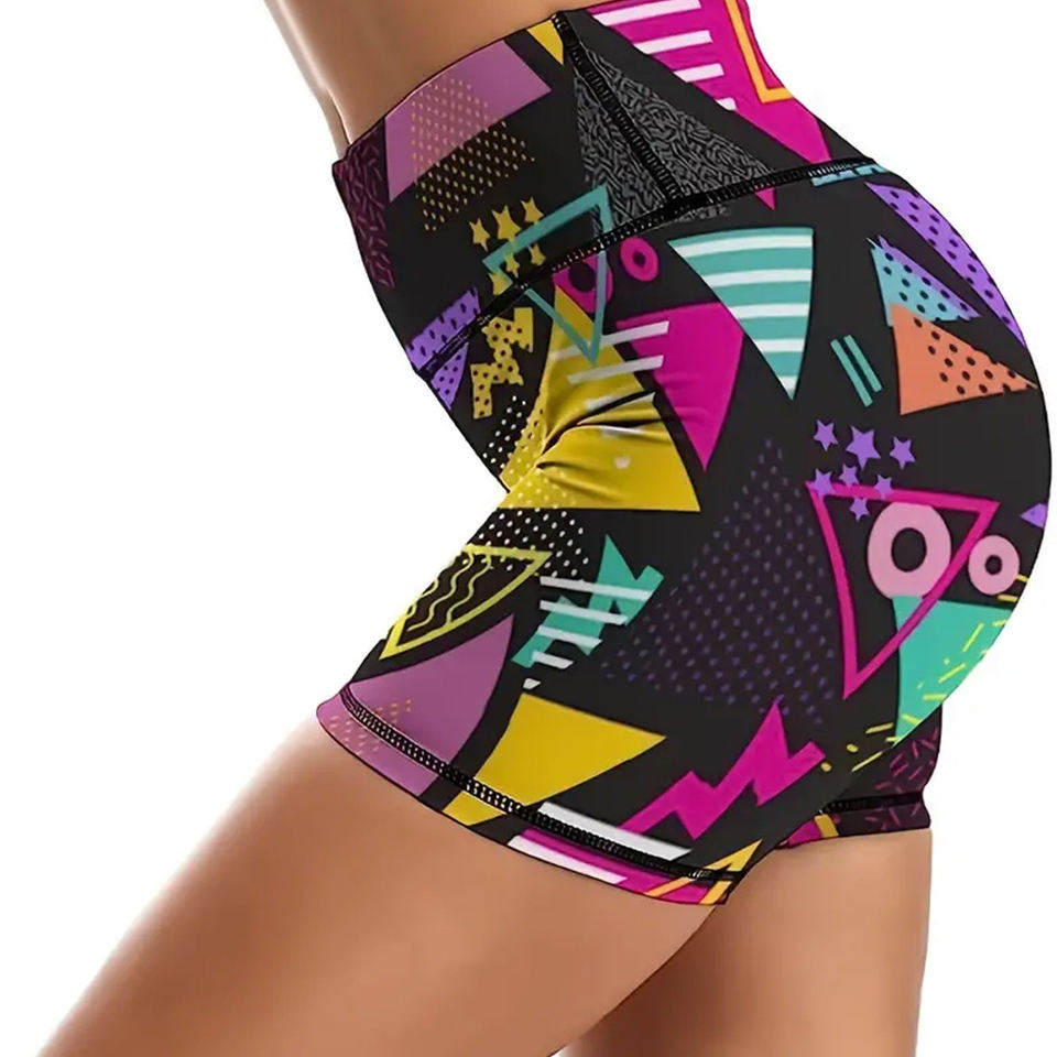 กางเกงขาสั้นเล่นโยคะสำหรับผู้หญิงเอวสูงควบคุมช่วงท้องลายเรขาคณิตสำหรับเล่นกีฬาวิ่งขี่จักรยาน