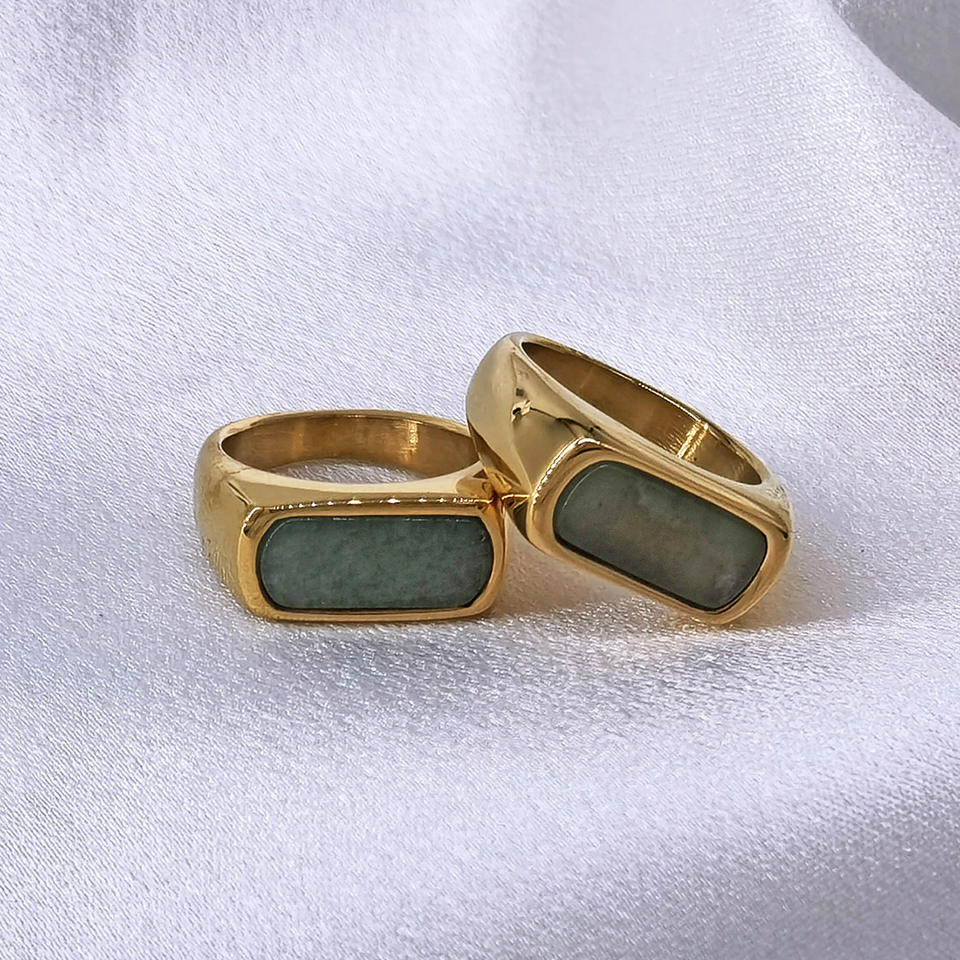 แหวนทรงเรขาคณิตชุบทอง 18K ไทเทเนียมสตีล ประดับหยกเทียม ดีไซน์แบบฝังขอบ สำหรับทุกเพศ เครื่องประดับแฟชั่น ของขวัญ
