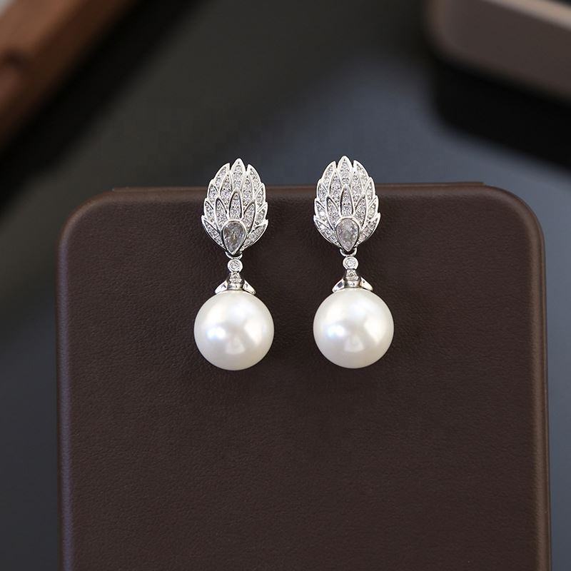 ต่างหูทรงเจ้าหญิงทรงเรขาคณิตประดับเพทายสีเงินเทาและมุกแท้ ดีไซน์หรูหราเคลือบทองบนทองแดง เหมาะสำหรับเป็นของขวัญ