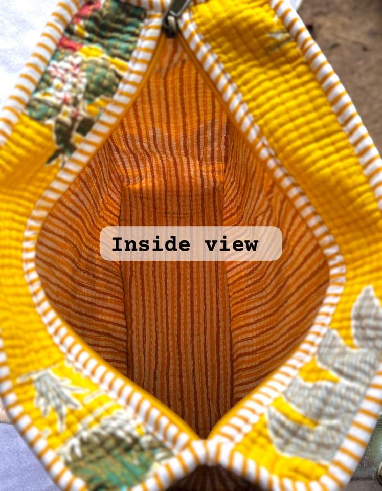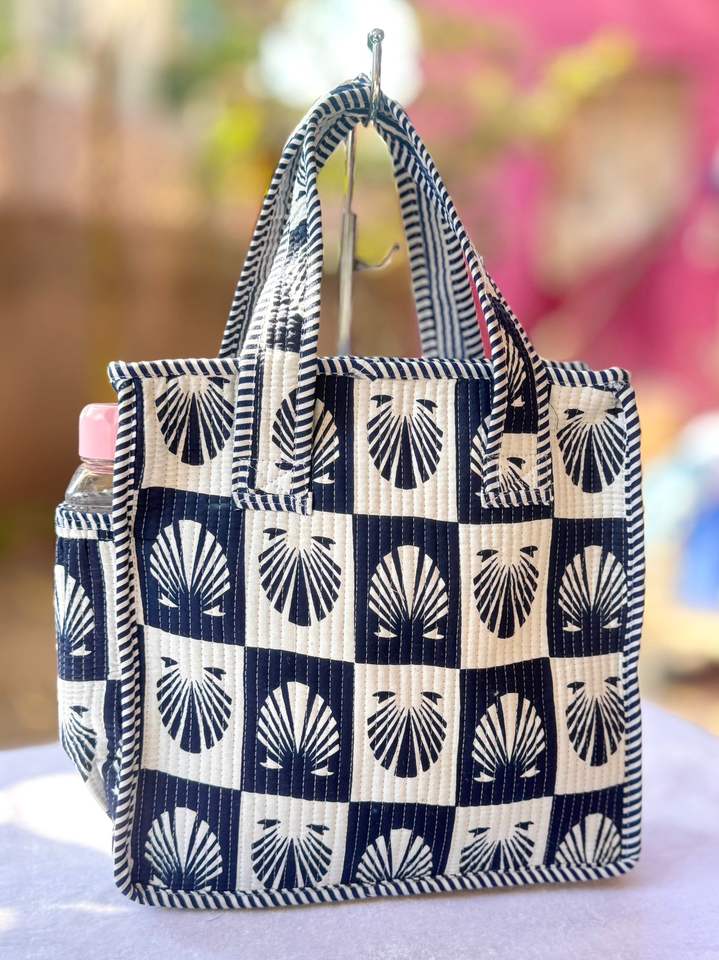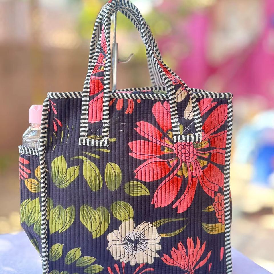 กระเป๋าโท้ทผ้าฝ้ายพิมพ์ลายบล็อกอินเดียแบบควิลท์ ทรงเรขาคณิต แฟชั่นฤดูร้อน/ฤดูหนาว สำหรับผู้หญิง แบบมีฝาปิดสองชั้น