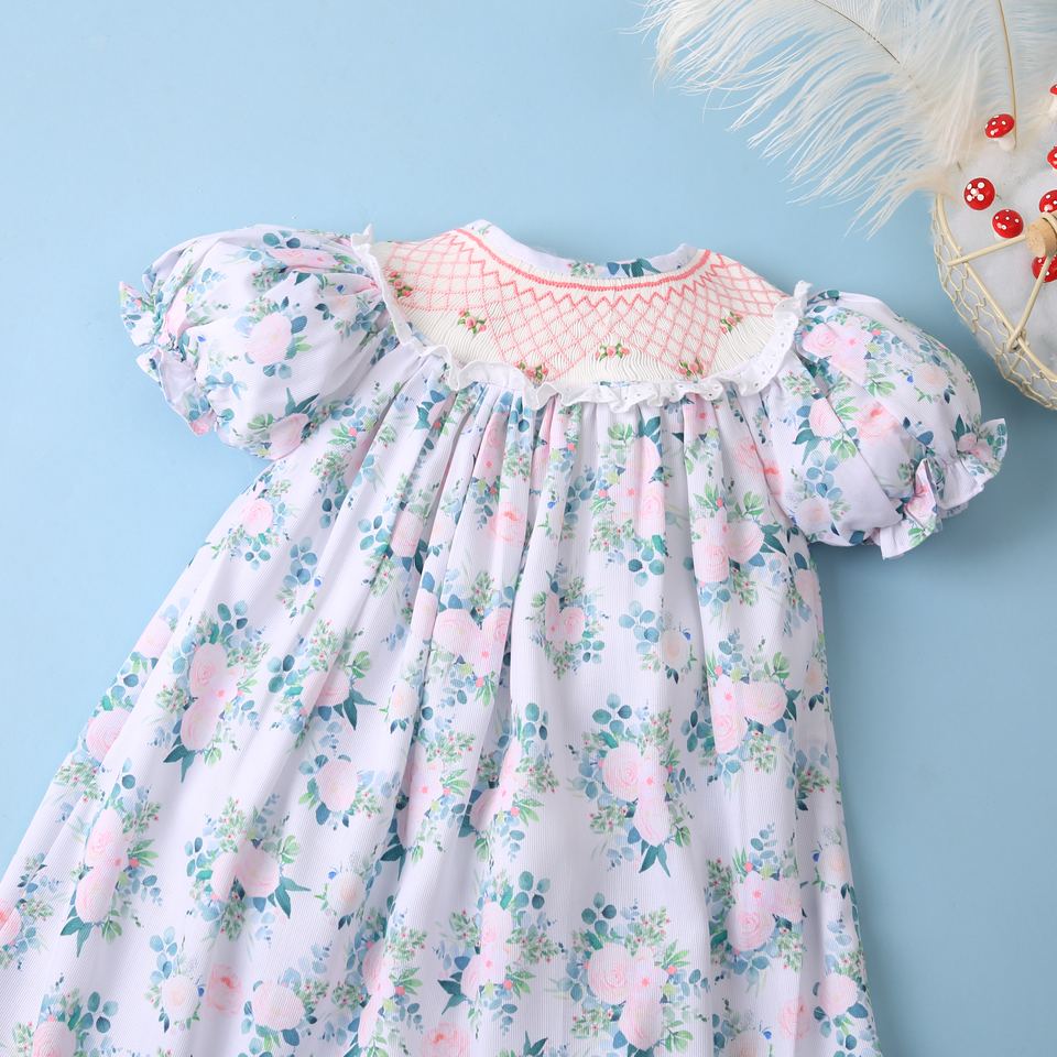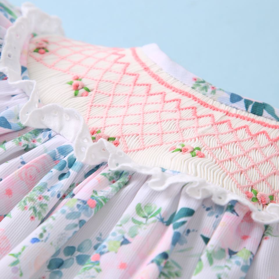 ชุดเดรสแขนยาวปักลายดอกไม้เรขาคณิต BB2182ทรงเอไลน์คอตตอน100% ฤดูใบไม้ผลิ