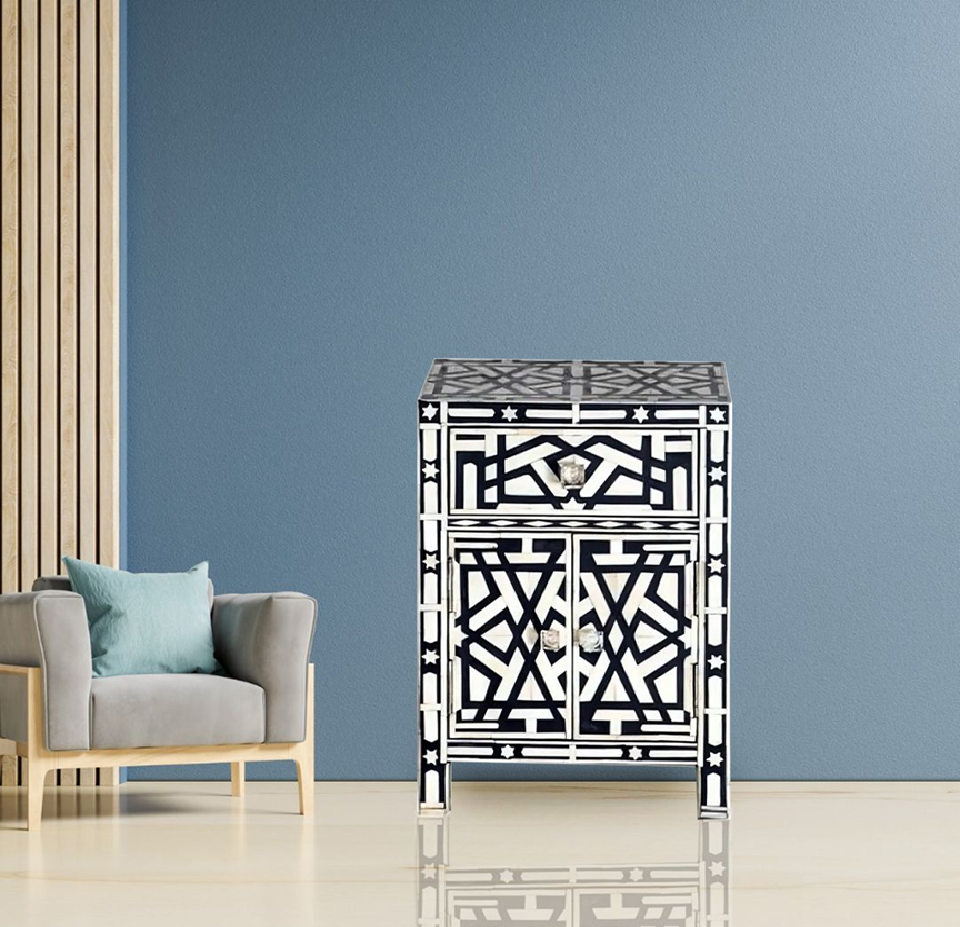 ตู้ข้างเตียงลายกระดูกสีเทาแบบเรขาคณิต มีจำหน่ายในราคาขายส่งในทุกคำสำคัญสำหรับการตกแต่งบ้านสไตล์โมเดิร์น