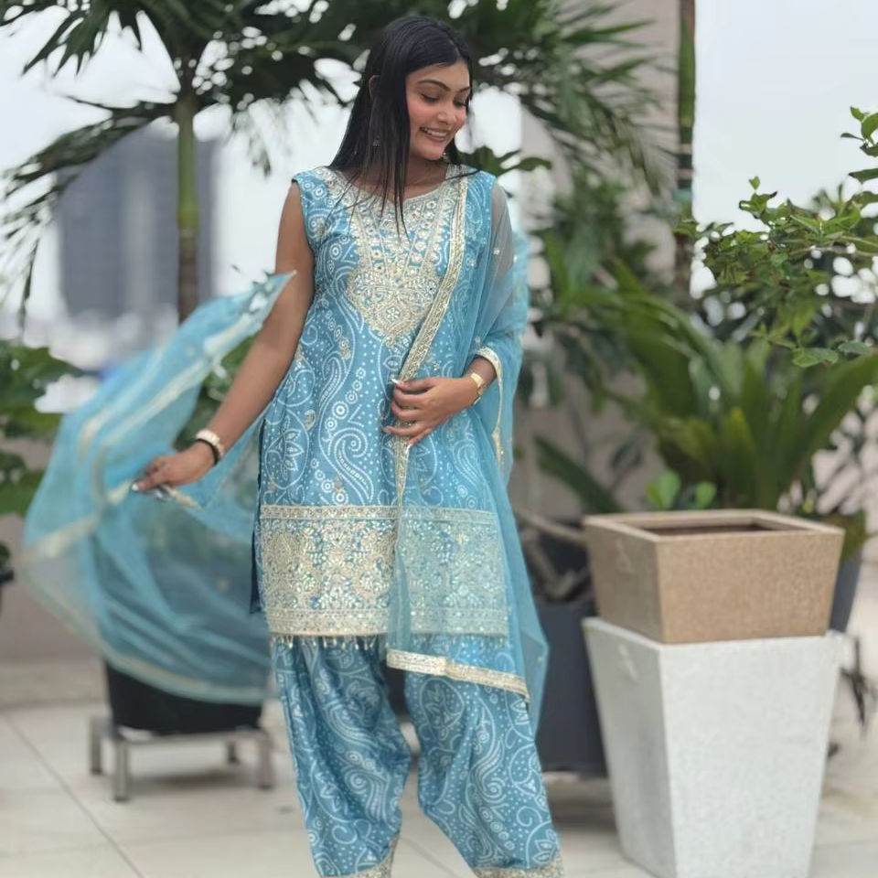 คุณสมบัติ:ชุดกางเกงขาสี่ส่วนและเสื้อ Kurta ทรงตรง พร้อมผ้าคลุม