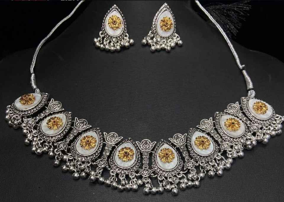 สร้อยคอแฟชั่น Navaratri สีเงินเยอรมันพิเศษออกซิไดซ์พร้อมต่างหูคู่สำหรับสุภาพสตรีสาวๆในงานแต่งงาน