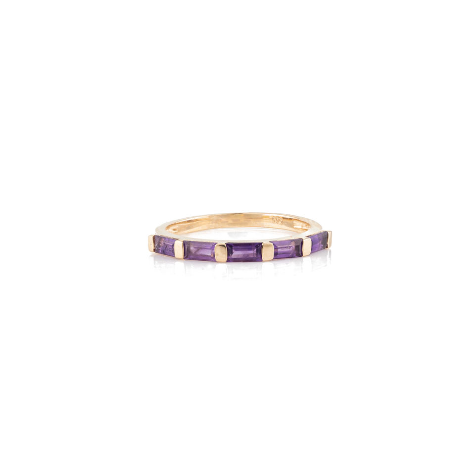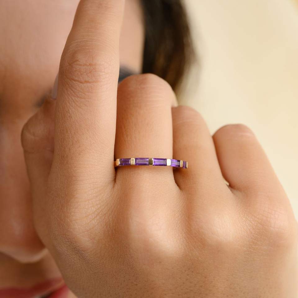 รับคอลเลกชันที่สวยงามล่าสุดของอเมทิสต์ธรรมชาติบาแกตต์ตัดแหวนวงนิรันดร์ในเครื่องประดับทองคําเหลืองแข็ง 14K สําหรับผู้หญิง