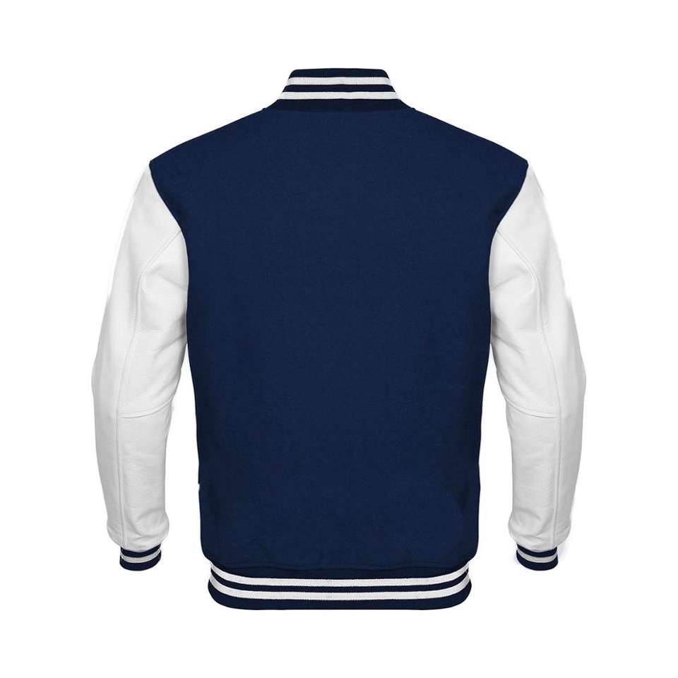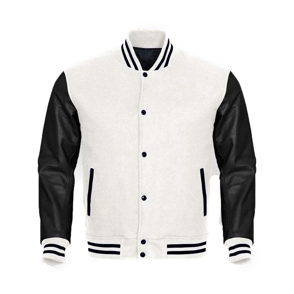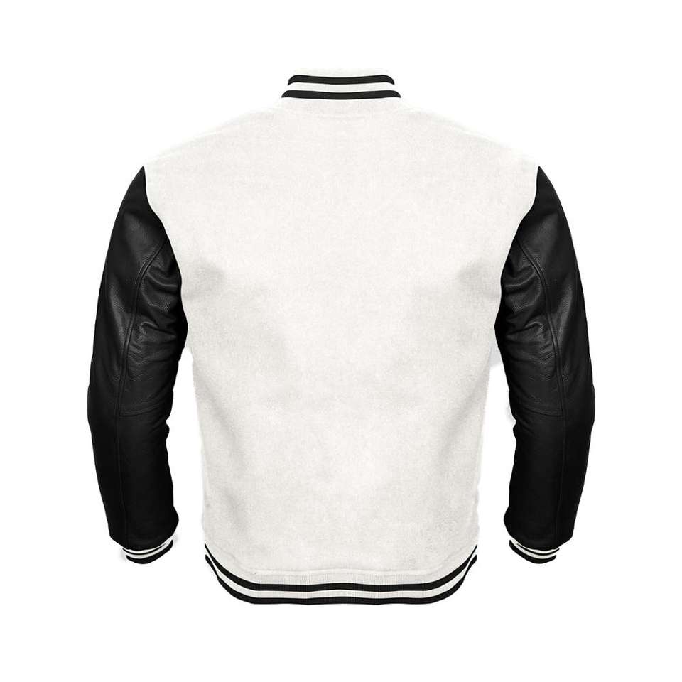 รับสั่งทำเสื้อแจ็คเก็ตเบสบอลหนังสีขาวแขนหนังสีขาว แต่งตัวอักษรปักด้วยขนสีดำ สำหรับผู้ชาย สไตล์วิทยาลัย