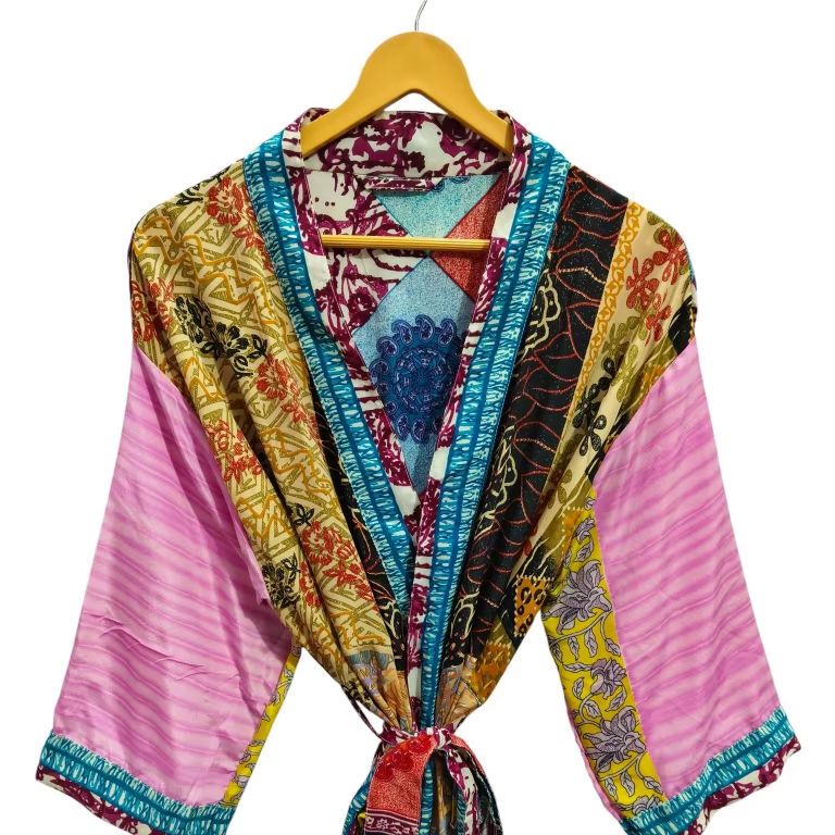ของขวัญสำหรับเธอ เสื้อคลุมกิโมโนแบบปะติดปะต่อ ชุดคลุมบิกินี่ ชุดนอน เสื้อคลุมยาว งานแฮนด์เมดสไตล์อินเดีย วินเทจ ทำจากผ้าไหมซารีรีไซเคิล