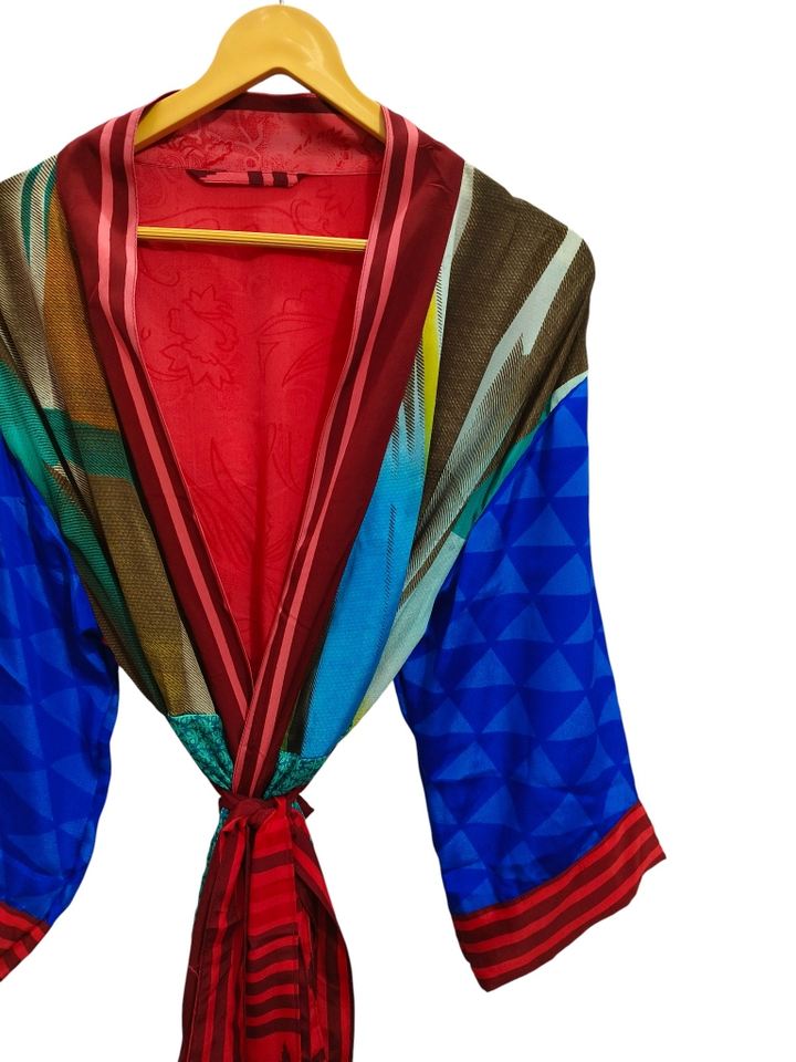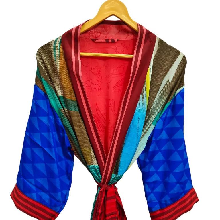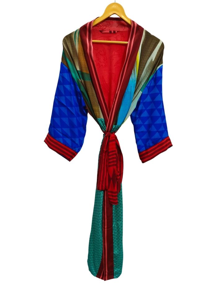 ของขวัญสำหรับเธอ เสื้อคลุมกิโมโนแบบปะติดปะต่อ ชุดคลุมบิกินี่ ชุดนอน เสื้อคลุมยาว งานแฮนด์เมดสไตล์อินเดีย วินเทจ ทำจากผ้าไหมซารีรีไซเคิล