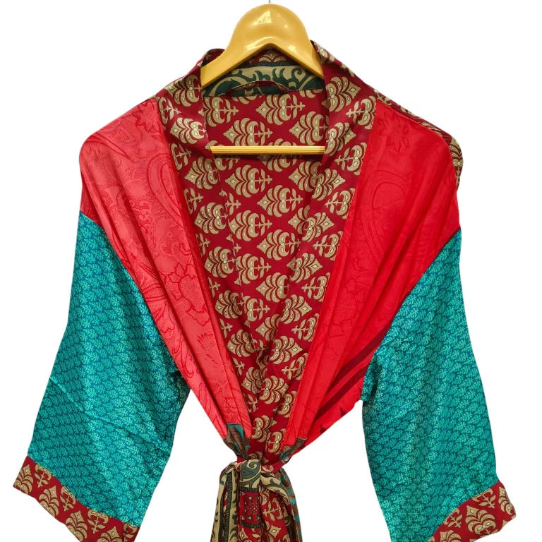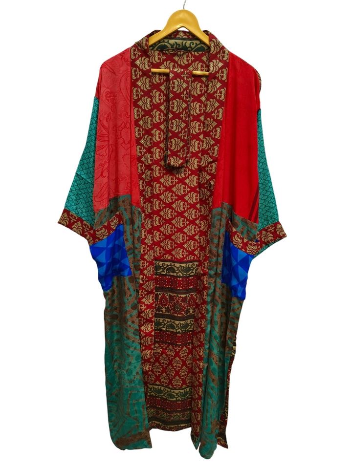 ของขวัญสำหรับเธอ เสื้อคลุมกิโมโนแบบปะติดปะต่อ ชุดคลุมบิกินี่ ชุดนอน เสื้อคลุมยาว งานแฮนด์เมดสไตล์อินเดีย วินเทจ ทำจากผ้าไหมซารีรีไซเคิล
