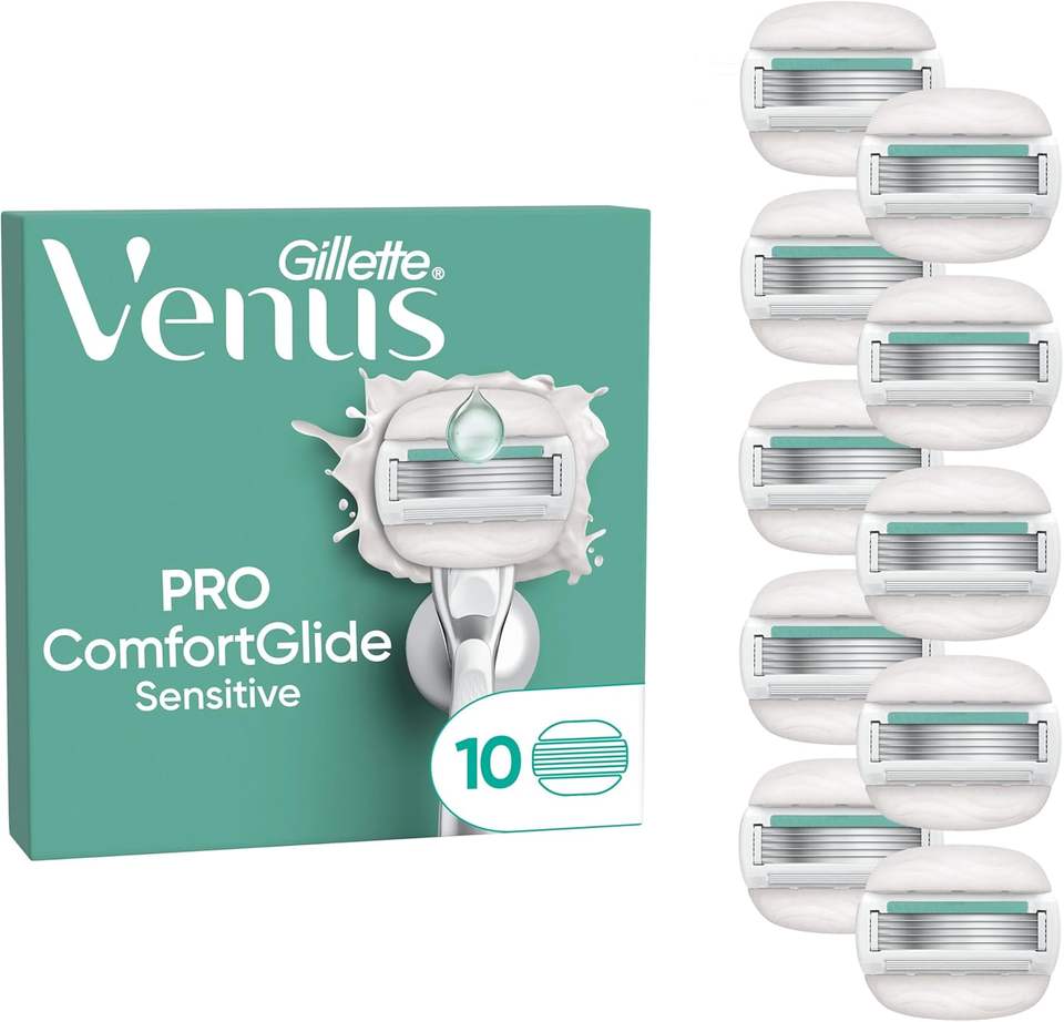 Gillette Venus Pro comfortglide ใบมีดผู้หญิงที่มีความไวต่อการสัมผัสของว่านหางจระเข้, ใบมีดเติม10ใบ, ที่จับโลหะที่นำกลับมาใช้ใหม่ได้