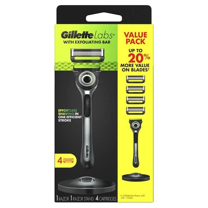 GilletteLabs พร้อมแถบขัดผิวโดยมีดโกน Gillette สําหรับผู้ชาย - ด้ามจับ 1 อัน เติมใบมีดโกน 4 อัน รวมขาตั้งแม่เหล็กระดับพรีเมียม