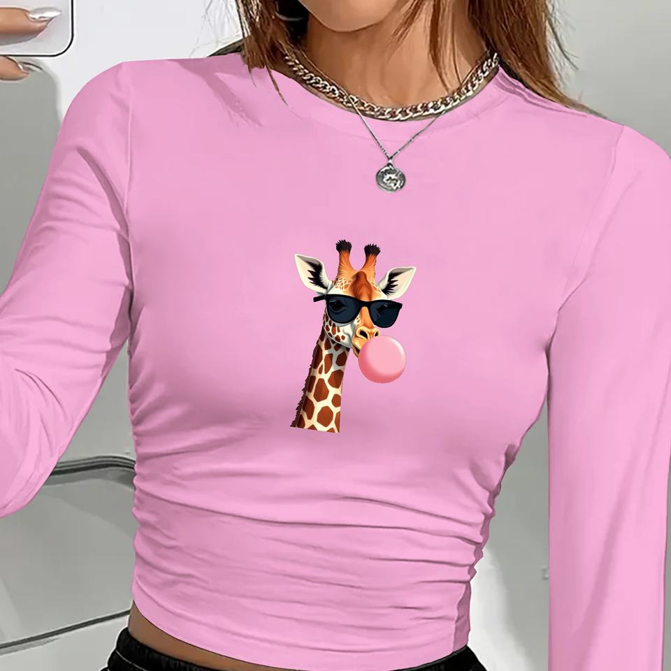 เสื้อเชิ้ตแขนยาวสำหรับผู้หญิงลายยีราฟเป่าลมสีชมพู