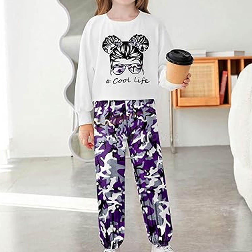 ชุด2ชิ้นเสื้อครอป + กางเกงลายพรางแขนยาวสำหรับเด็กผู้หญิงชุดเสื้อผ้าสำหรับฤดูหนาวฤดูใบไม้ร่วงชุดเสื้อผ้าสีม่วงสำหรับเด็ก