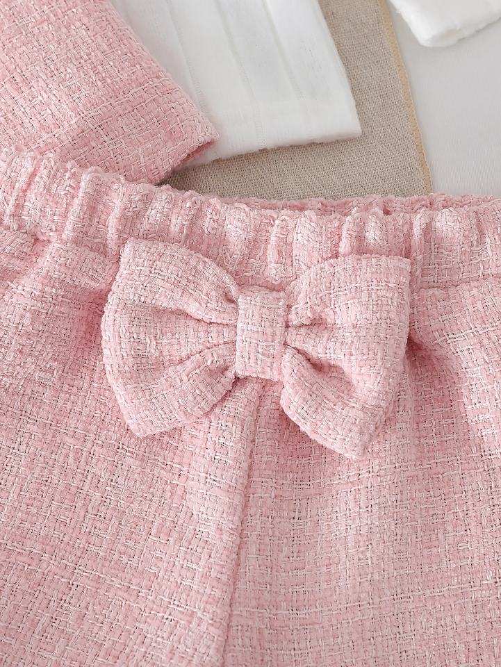 ชุดเสื้อยืดลายทางสำหรับเด็กผู้หญิงฤดูใบไม้ร่วงและฤดูหนาว + เสื้อกั๊กลายดอกไม้ + กางเกงขาสั้นประดับโบว์